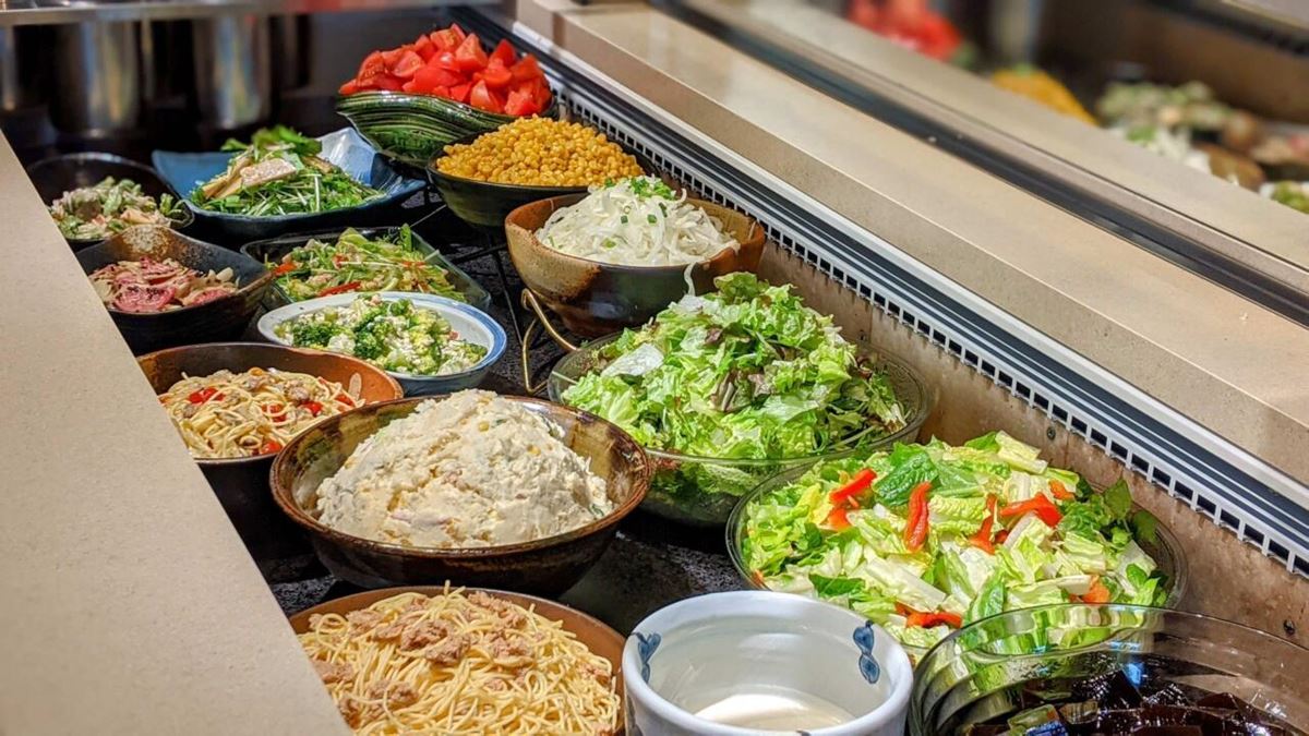 内容:新鮮サラダバー、大かまどごはん(またはパン)、たまごスープ