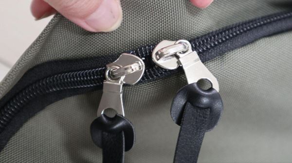 メインの荷室はダブルファスナー仕様で、上半分をガバッと開けられます。全開にすると中が一望でき、奥に入れたものもすぐ見つかります。