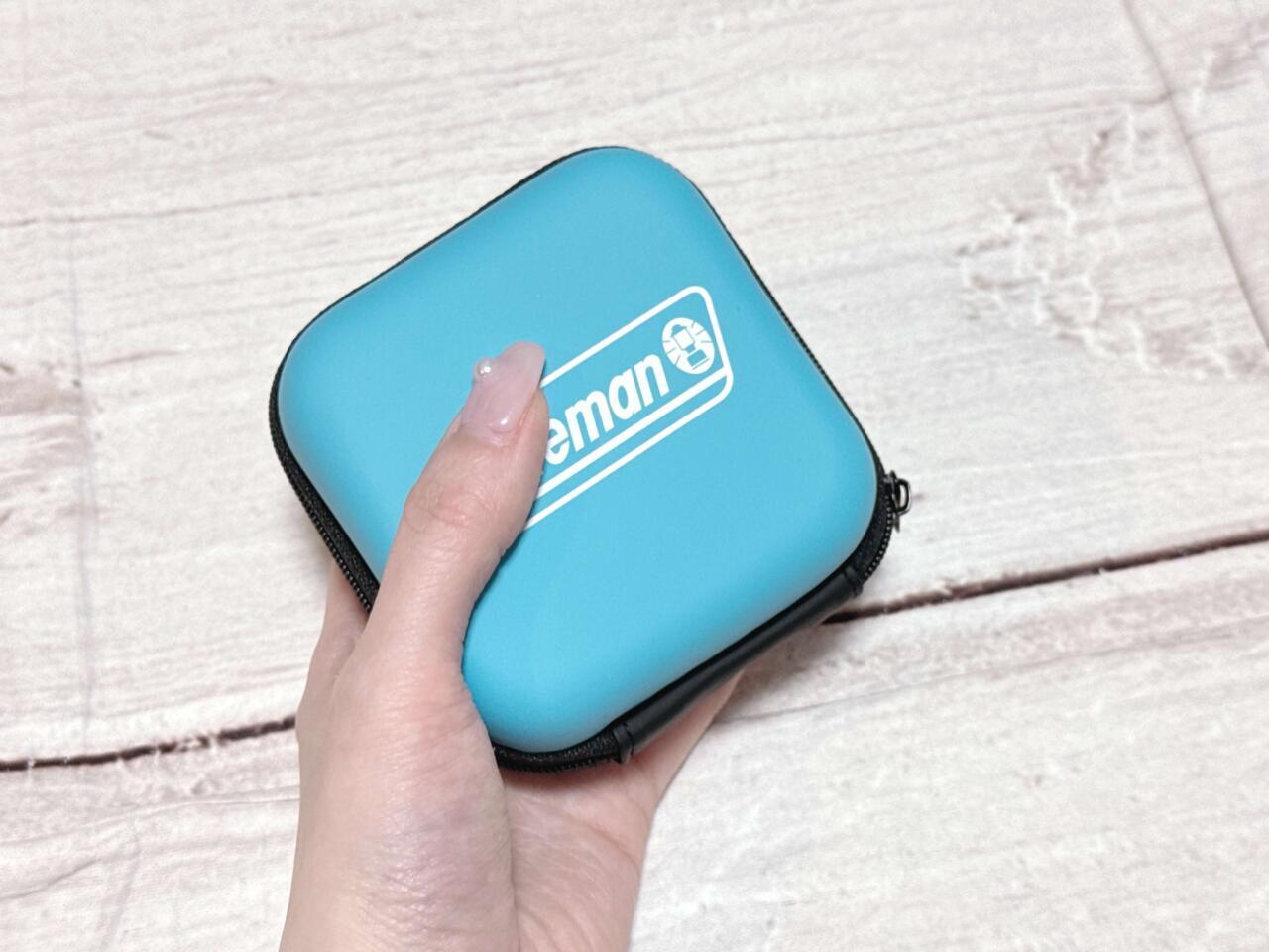 鮮やかなブルーが目を引くガジェットケース。フロントにはホワイトのコールマンロゴがプリントされており、シンプルながらも存在感のあるデザインです。