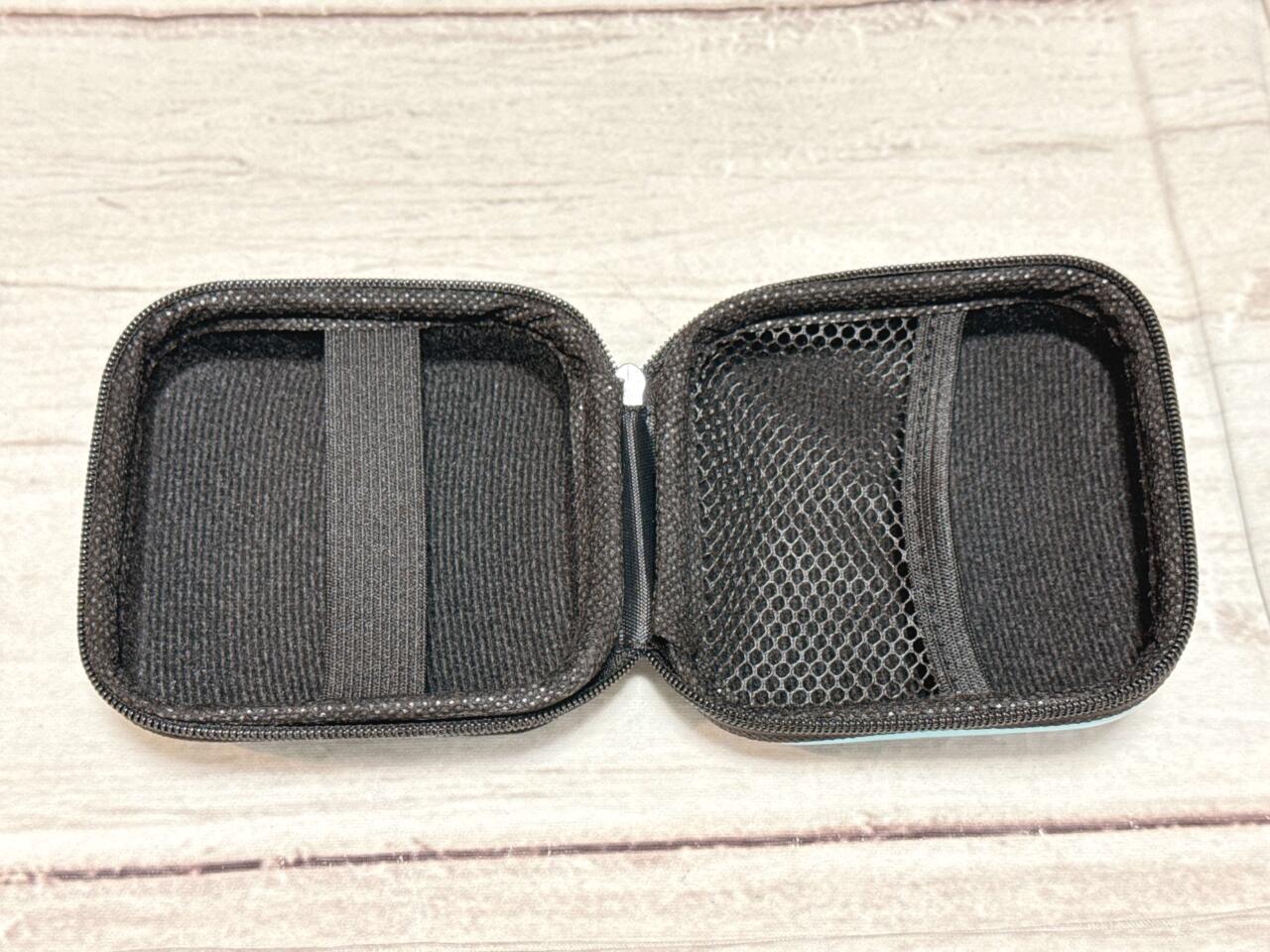 開閉はファスナー仕様。内側にはメッシュポケットとゴムバンド付きで、ケーブルやイヤホンなどをしっかり固定して収納できます。