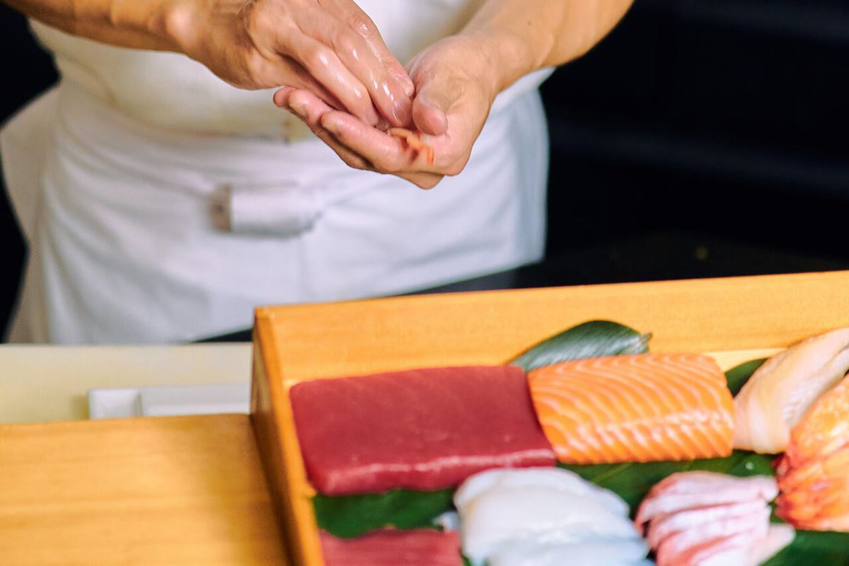 職人が一貫ずつ丁寧に握る寿司は、マグロ、イカ、サーモンの3種を中心に、ディナータイムでは6種のネタが登場します。