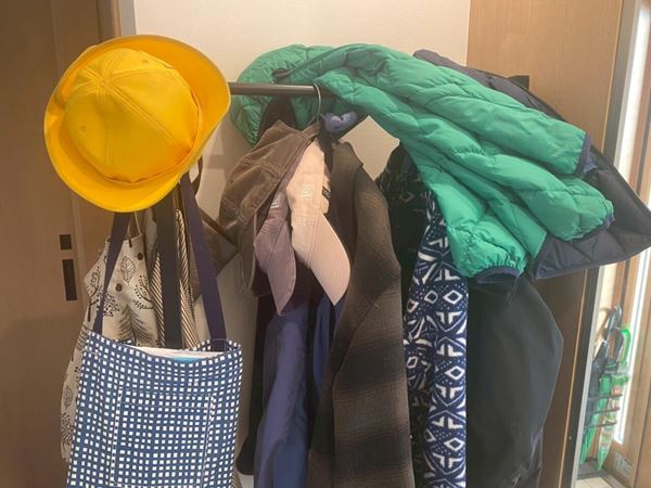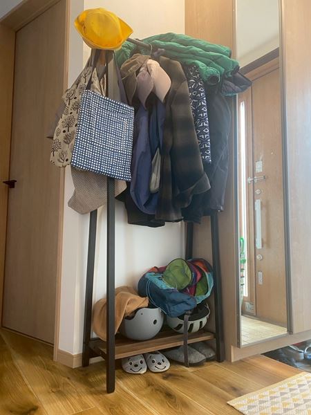 筆者宅は小学生の子どもと夫婦の3人家族。玄関ラックには家族それぞれのバッグや帽子が無造作にかけられていて、ごちゃごちゃした状態が長年の悩みでした。