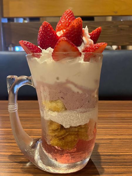 びっくりドンキーでは現在、「完熟いちご」をテーマとしたスイーツが提供中。もちろんジョッキパフェも登場している。