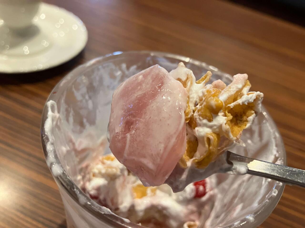 そんなシフォン×マスカルポーネ層を食べ終えると、パフェもいよいよ終盤。最後に待っているのは、パフェの定番コーンフレークと、たっぷりのいちごゼリーだ。食感のアクセントを加えつつ、ゼリーでさっぱりと締められるのも良い。