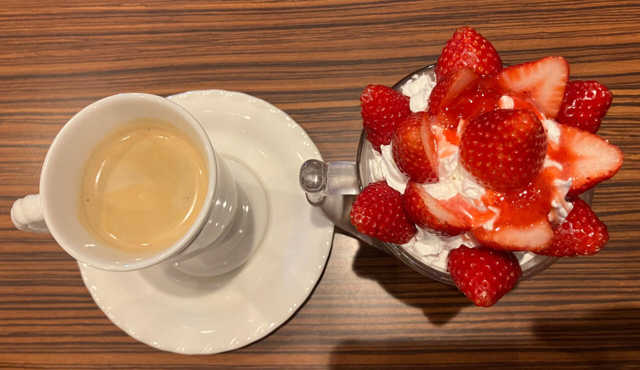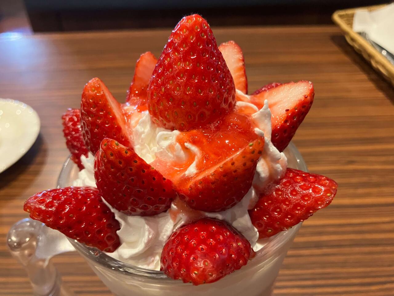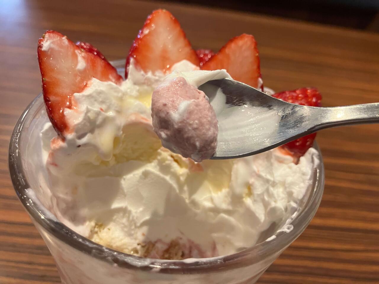 そんないちごと、ホイップクリームの相性が良くないわけがない。甘めのいちごソースもいい仕事をしている。いきなりびくドンスイーツのポテンシャルを感じるスタートだ。