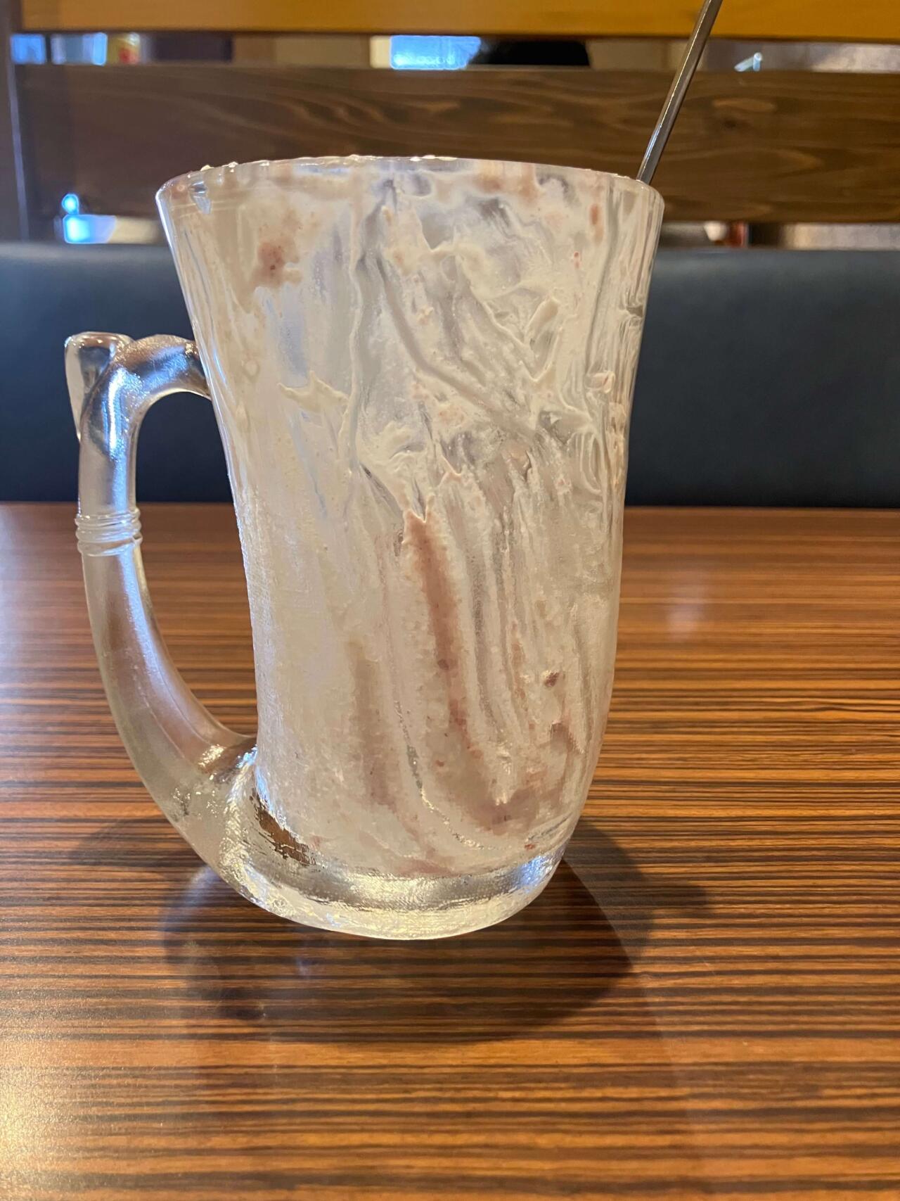 個人的にジョッキパフェの場合、このようにジョッキの半分側を残しながら食べるのが好き。【びっくりドンキーのジョッキパフェ】