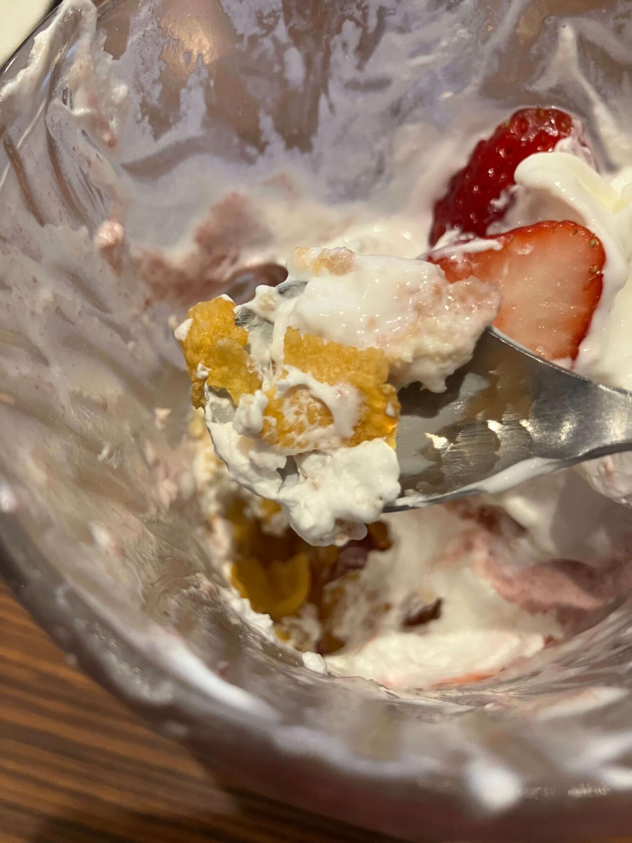 コーンフレークといちごゼリーを一緒に食べると、食感が楽しいよ。【びっくりドンキーのジョッキパフェ】