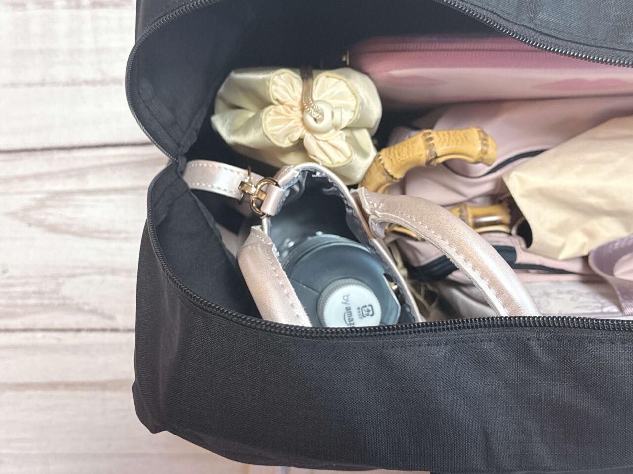 続いて、PCケースに入れたノートPCと折りたたみの晴雨兼用傘を収納。さらに550mLペットボトルを入れたボトルショルダーや、旅行の際は容量の関係で断念することが多いヘアアイロンも入れてみました。
