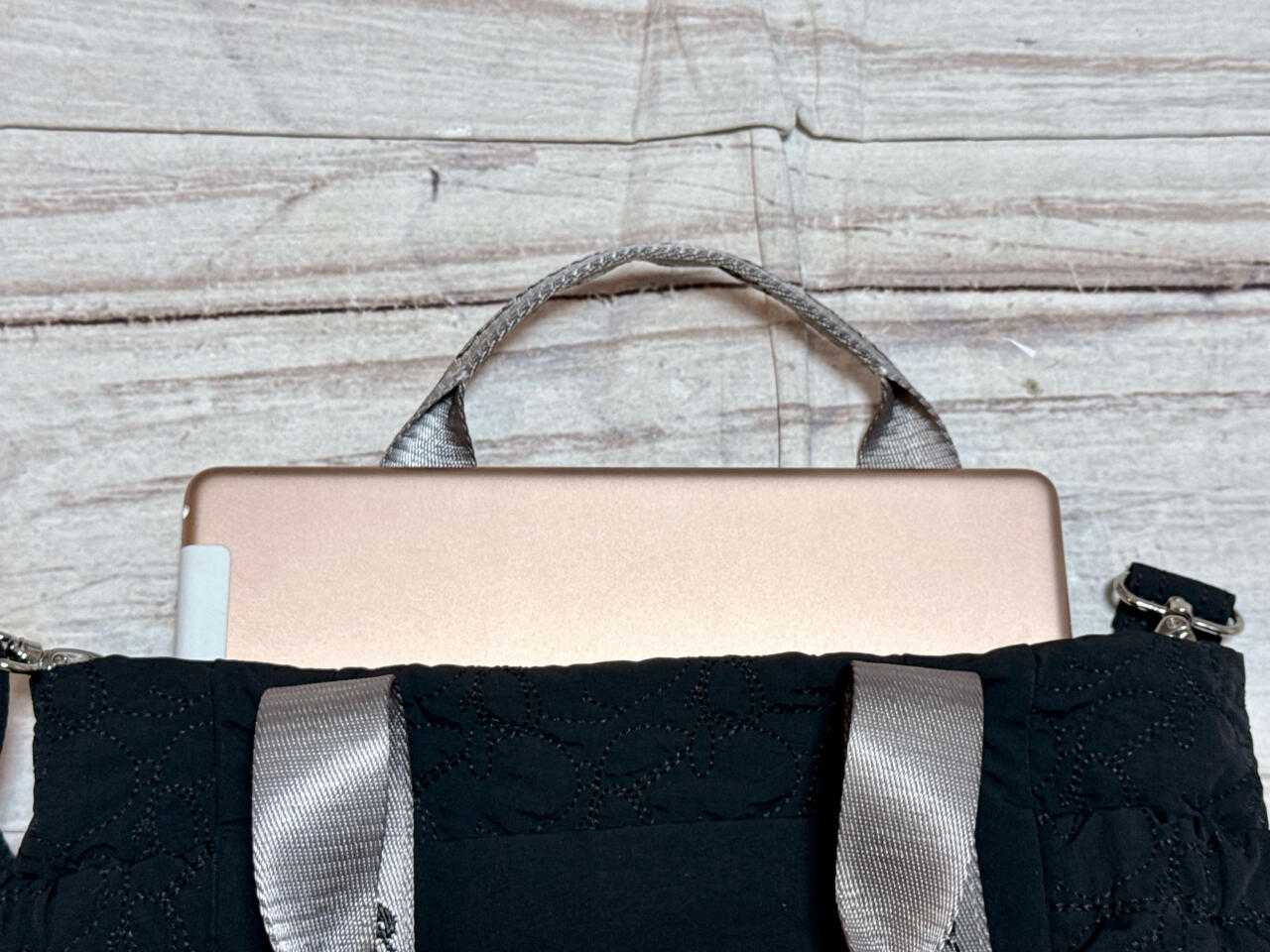 iPad(第7世代)が収納できる便利なサイズ感。タブレットを持ち歩く方にもおすすめです。キーボード付きのケースに入れた状態でも収納でき、ファスナーの開閉もスムーズでした。