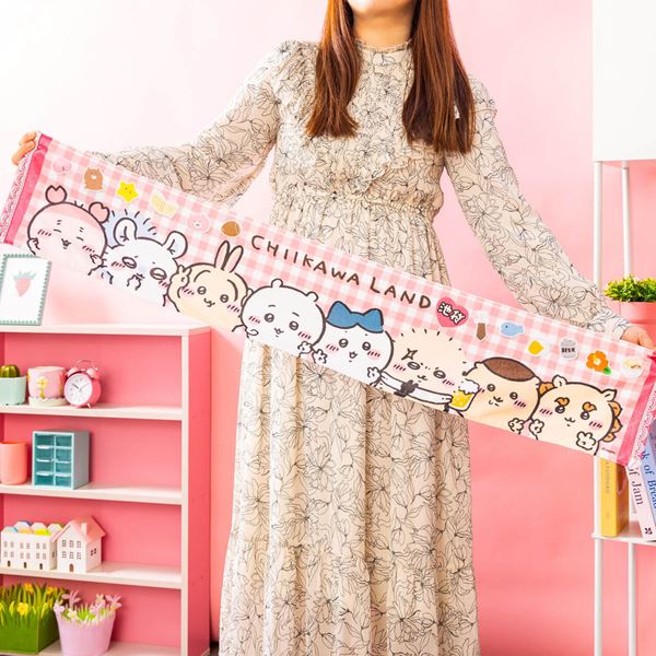 ピースしたちいかわたちが並んだマフラータオルや、推しうちわをミニサイズにしたキーホルダーなどが登場。