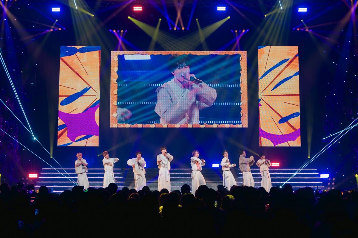 そして披露したのは、8人で初めて作詞をしたという未発表の新曲『You’re my path』。彼ららしい明るいサウンドと、感謝と前向きな夢への道を感じさせる歌詞が印象的で、スクリーンには手書きの歌詞が乗る。さらには古瀬が途中涙を流すシーンも見受けられた。そして、最後には肩を組み、メンバーが横1列でつながった状態でフィニッシュ。