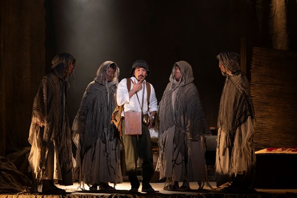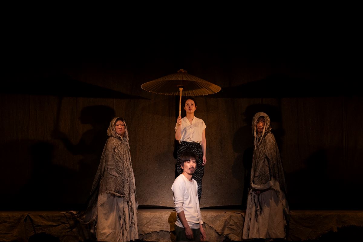 まず舞台上に登場するのは、4人の“人影たち”。彼らによってこれから登場する男がどんな人物なのか、そして彼が踏み入れた村がどんな場所なのかが語られていく。そこに漂うのは、なんとも不穏な空気。彼の身にこれからふりかかる惨事を、まるで予感させるようだ。そして男が客席から現れる。人影たちとは全く異なり、その足取りは軽く、生命力に溢れている。だがしばらくすると、人影たちもいつの間にか男のいる客席へ。二者の空間が混ざり合ったことで、男がこれまでとは違う場所に、知らぬ間に迷い込んでしまったことを示唆する。