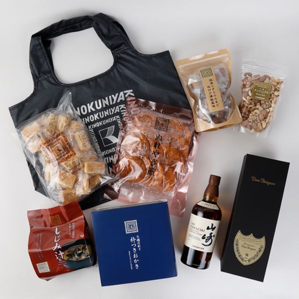 そして、最も贅沢なのが、シングルモルトウイスキー山崎とドン・ペリニョンを詰め合わせた豪華セット!おつまみパイやナッツ、ぬれやき煎など、お酒に合うおつまみも充実しています。
