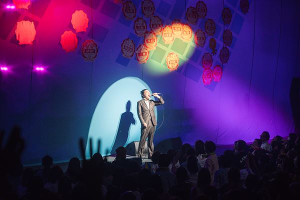 「事件だッ!」終盤でトータスは舞台袖へと引っ込み、『おっさんのダンスが変だっていいじゃないか!』のイントロが鳴り始めると、そのMV風の衣装にお色直ししたトータスが現れる。ファンキーでソウルフルなナンバーでトータスは変なダンスを踊り、ジョンBもマラカスを振りながら変なダンスを踊っている。トータスがスリラーダンスに移行したところを観ていたら、気が付くとトータスが観客席から観客を引きずり上げていた!? それもおっさんの観客! ひとりふたり、いつの間にやら4人の「おっさん」観客が舞台に引きずり上げられて、トータスと変なダンスを踊っている。トータスは、一人ひとりと握手してハグして観客席へと戻していたが、これも先程の「借金大王」事件と同じくスタッフ、メンバー誰も知らず、トータスのその場でのアクション。やはり予定調和にさせず、何かを仕掛けていくトータスのストロングスタイルな魅せ方に腰を抜かすしかない……。