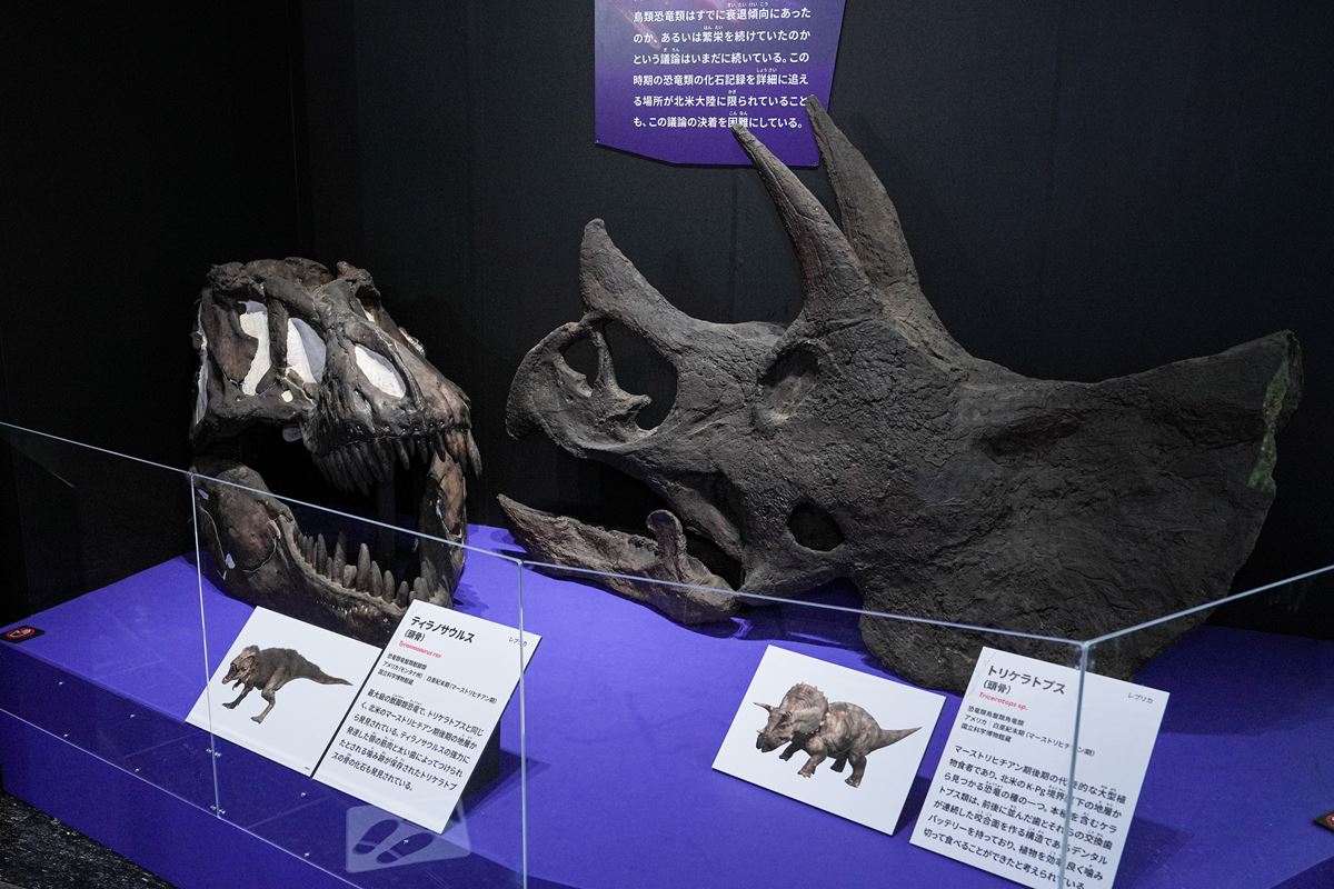 恐竜を含む地球上の生物種の約70%が大量絶滅した白亜紀と古第三紀の境界。『ティラノサウルス』と『トリケラトプス』の骨格レプリカが対峙する形で展示され、その圧倒的なスケールを間近に観察できる。