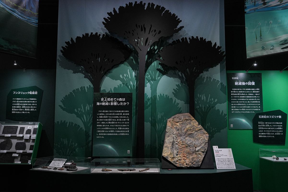 F-F境界はデボン紀後期の大量絶滅で、陸上に森林が広がった時代。国立科学博物館所蔵の『ワッティエザ(レプリカ)』などが展示され、植物と昆虫、脊椎動物の密接な関わりが示されている。