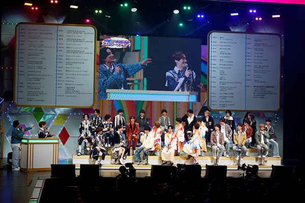 大阪松竹座お馴染みの緞帳が上がると、懐かしい過去映像の数々がスクリーンに映し出される。オープニングのトップバッターを飾ったのは、Aぇ! group。黒×ゴールドにファーをあしらった衣裳に身を包み「松竹座!今日は俺たちと最高の卒業式にしようぜー!」と煽る末澤誠也の声で「Firebird」が始まり、「アオハル -With U With Me-」で登場したなにわ男子は「アオハル、しよっ!」と道枝駿佑が爽やかなキュンセリフでファンのハートを射抜く。階段ステージ上に“ええじゃないか”ポーズのWEST.が現れると客席の歓声がさらに大きくなり、3グループ一緒に「バンバンッ!!」へ。そこへ西畑大吾の呼び込みで永瀬、向井、室、今江が次々に姿を現し、花道を使ってみんなで盛り上げる、関西ジュニア時代の光景がステージに甦った。続いてステージの盆が回り、大倉忠義の力強い太鼓でSUPER EIGHTが登場。デビュー曲「浪花いろは節」でさすがの貫禄を見せつける。村上信五の仕切りで始まった小MCでは、重岡大毅、大橋和也、小島健が順に挨拶し、永瀬、向井、室、今江も並んでわちゃわちゃトーク。そんな姿を見つめる客席に多幸感が広がっていく。ここからは桐山照史と藤原丈一郎に仕切りをバトンタッチして、4グループでバラエティ企画に挑戦。事前アンケートの回答をもとに『ほんまにおおきに大阪松竹座!いろいろあったでヒストリーランキング』と題して、松竹座で過ごした思い出を振り返った。ひとつ目は「私は見た!公演中にいろいろあったでランキング」。濵田崇裕が『少年たち』で看守役を演じたときの失敗談を話すと、他のメンバーたちもセリフが飛んで頭が真っ白になったり、早着替えに間に合わなかったりと失敗談が続々出てくる。2つ目は「私は知っている!舞台裏でもめちゃくちゃやったでランキング」。ここでもそれぞれのメンバーからの情報提供をもとに、今だから笑えるエピソードが飛び出して松竹座中が笑いに包まれた。