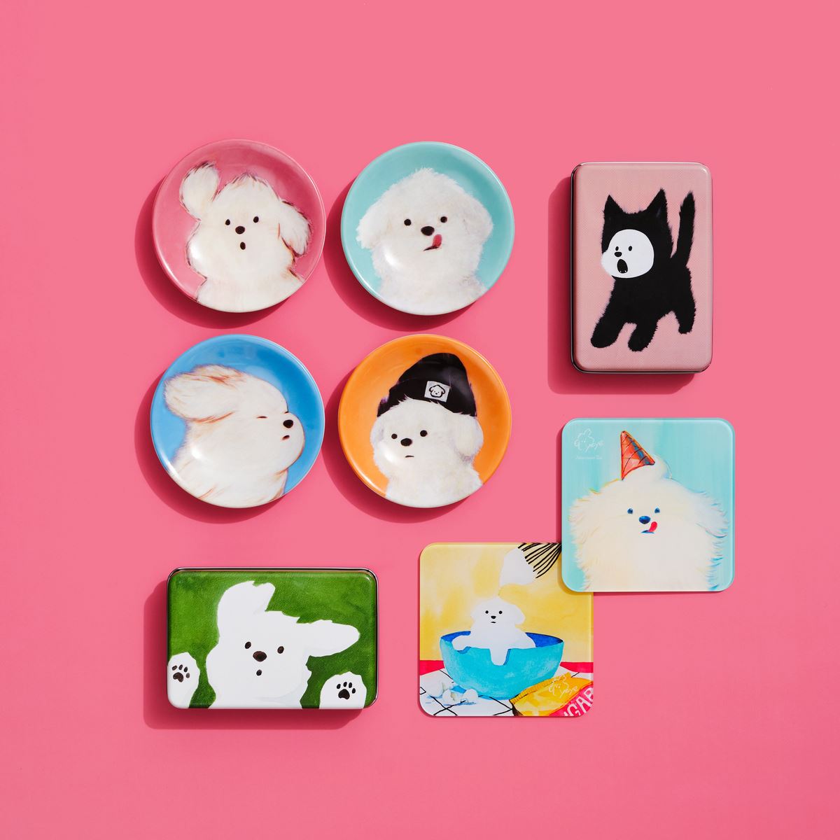 白くふわふわとした毛並みと、垂れた耳が印象的な愛犬・ムンゲの愛らしい表情を優しく表現した、繊細なタッチから温もりあふれるイラストまで、多彩なアプローチで表現されたアートがデザインされています。