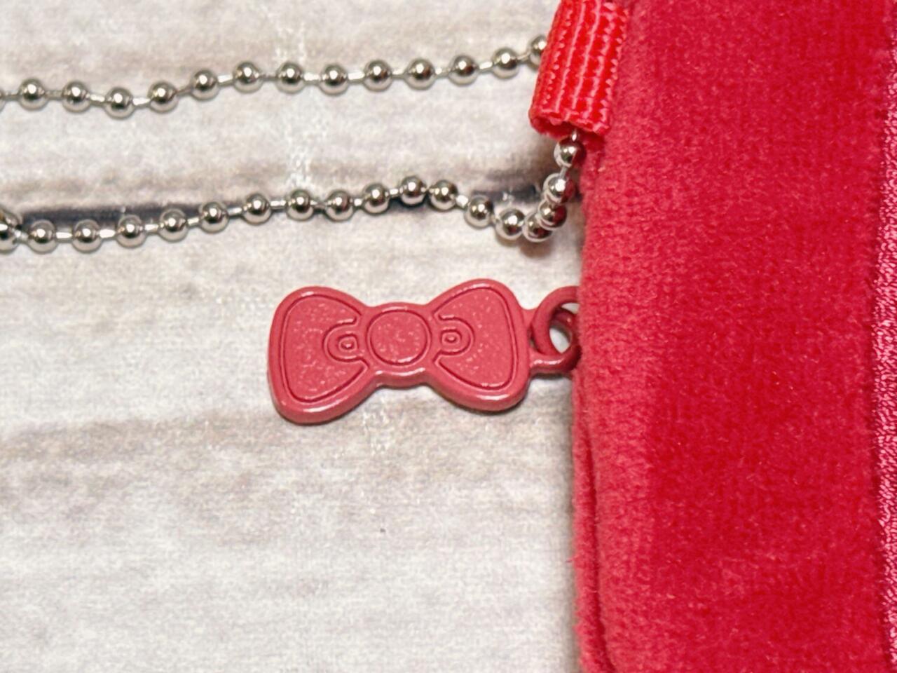 背面にはファスナー付きで、小物を収納できる仕様。個人的にときめいたのは、ファスナーの引き手についたチャームです。キティちゃんのリボンモチーフになっており、細部までこだわりを感じます。