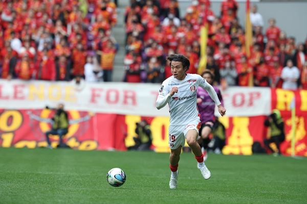 名古屋は京都サンガF.C.の本拠地に乗り込むと、9分CFマルコ・トゥーリオとGKピサノ・アレックス幸冬堀尾の1対1、11分M・トゥーリオのクロスを右WG奥川雅也が落とし左IH平岡大陽にシュートにつなげられるなど序盤からヒヤリ。ならば名古屋は18分、右CB野上結貴のパスを受けた右WB甲田英將が右サイドからカットインしてからゴール前にシュート性のクロスを蹴り込んだ。相手GKとDFはCF山岸祐也と左WB中山克広に気を取られるあまり、鋭いクロスがそのままゴールネットを揺らして先制ゴール。アカデミー育ちのプロ5年目が名古屋でのうれしい初ゴールをマークしたのだ。