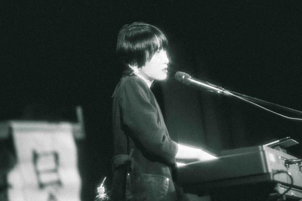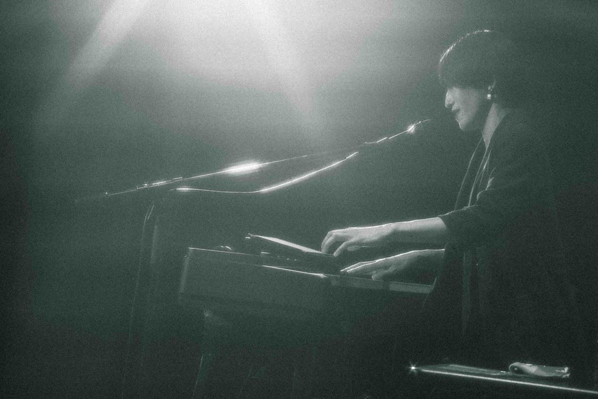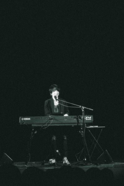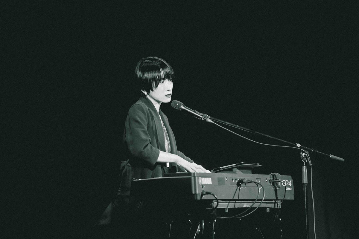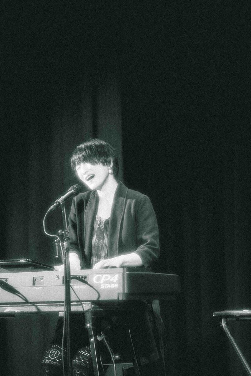 キーボードの前に座って放たれたのは「100」。焦るばかりでなかなか足が前に出ない自分を鼓舞するような楽曲にいきなり胸を突かれ、瞬く間に日食なつこの領域へと誘いこまれる。曲が終わった瞬間の、女性客の歓声も気持ちいい。 「浅草、江戸のど真ん中でございます。朝から晩まで、そこら中で“あやかし”どもがドンチャンドンチャン……」という口上から始まったのは、怪談めいた雰囲気と「99鬼夜行」。続く「√−1」は、彼女自身の大切な音楽仲間が亡くなったときに書かれた曲。この日は「卒業までたどり着けなかった者に向けて」と演奏されたのだが、どこまでが自分でどこまでお前かわからない関係のふたりが「存在しない数」を求め続ける姿を描いたこの曲の凄さはライブでこそその真価を発揮する。