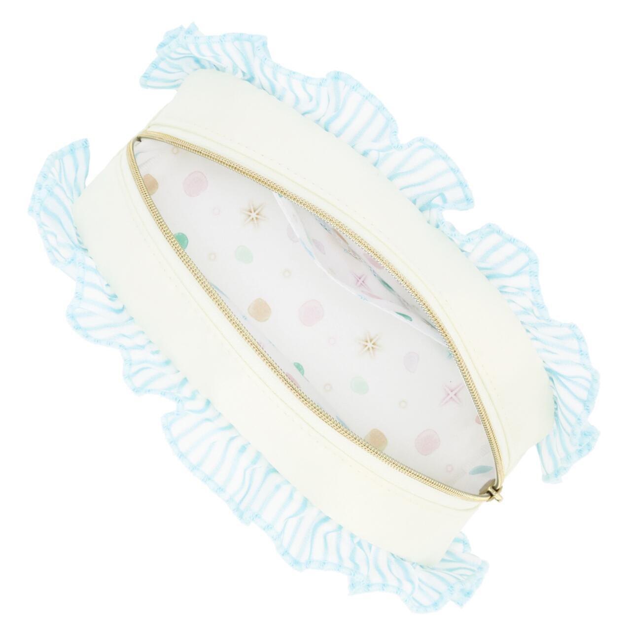 ポーチは、やさしいブルーのフリル付き。