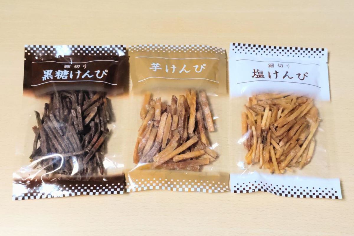 その名のとおり、通常の芋けんぴに加え、塩味と黒糖味の3つがセットになった商品です。