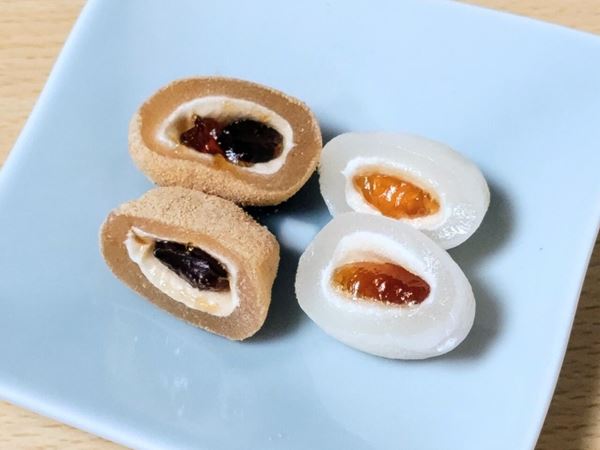 大福と聞くと中身はあんこのイメージがありますが、本品の味は、黒蜜きな粉とみたらしです。もっちり柔らかいお餅の内側には、ふんわり食感を生むマシュマロと特製ペーストが包まれていますよ。