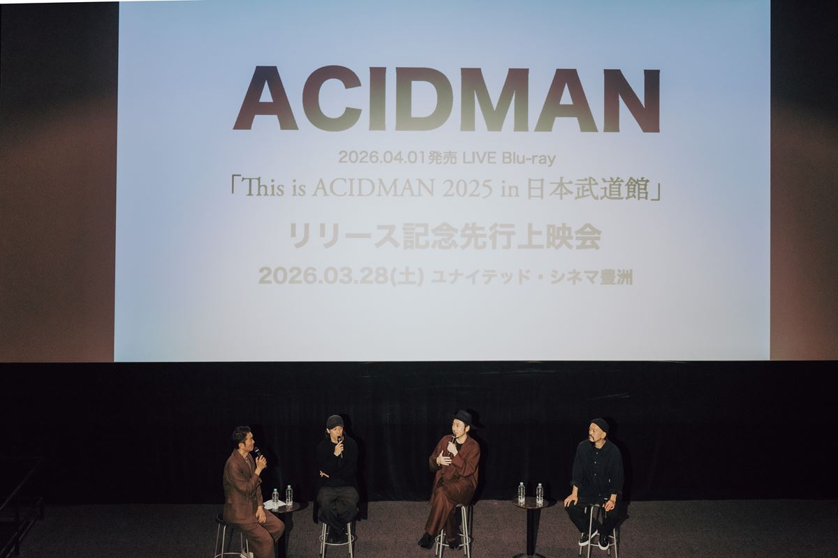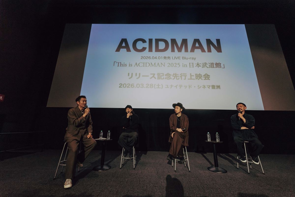 4月1日にリリースされたライブBlu-ray『This is ACIDMAN 2025 in 日本武道館』をいち早く体感できる先行上映会が、3月28日東京・ユナイテッド・シネマ豊洲で開催された。およそ3時間に及ぶ本編上映に加え、上映後にはACIDMANのメンバー3人が登壇する舞台挨拶も実施。武道館の熱量と緊張感を、映画館の大画面と大音量で再体験する特別な一日となった。