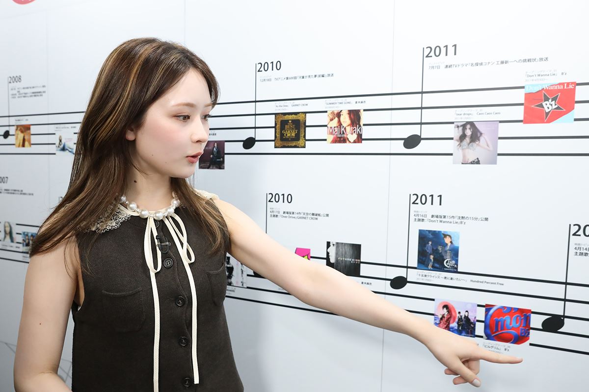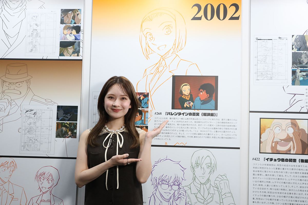 心に残る名場面を一挙に展示する【メモリアルシーンエリア】では、実寸大の新一と蘭の姿に「顔小さい! スタイル良! 足細!」と大興奮。記念の自撮りも行い、等身大の迫力を存分に楽しんだ。また、自身の生まれ年である「2002年」のパネルに展示された園子を見つけると、「園子ちゃん! 私の推しキャラです!!」と喜びを爆発させた。園子の好きなところを問われると、「いつもチャキチャキと走り回ってる感じ。何か問題が起きたときは、すごく蘭の頼りになる存在なんじゃないかなと思っていて、すごく推せます!」と止まらぬ“園子愛”を熱弁した。