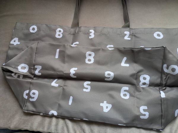 上品なブラウンに人気の数字柄「SO-SU-U(ソスウ)」柄をデザインした特大のお買い物バッグ。毎日のお買い物のほか、スポーツクラブやちょっとした旅行にも活躍してくれそうです。