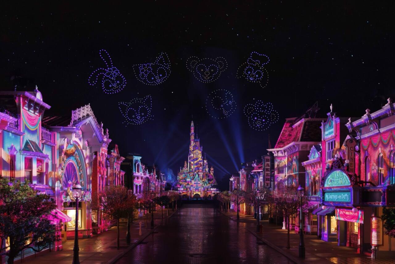 ドローンがお城に対してかなりの大きさで大迫力!!ダッフィーたちのお顔も夜空いっぱいに描かれます。