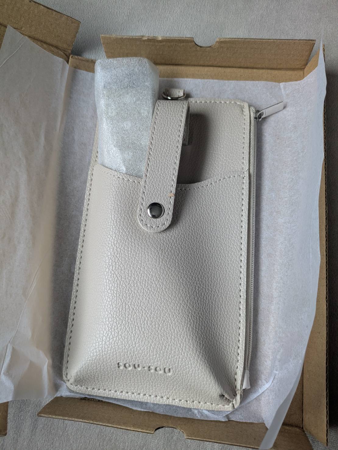 「SOU・SOU(ソウ・ソウ)」のレザー調スマホポシェットは、落ち着いたベージュカラーで、ファッションを選ばず、スマホを持ち運ぶことができるポシェットです。※画像ではグレーに近く見えますが、もう少し落ち着いたベージュ寄りの色味です。