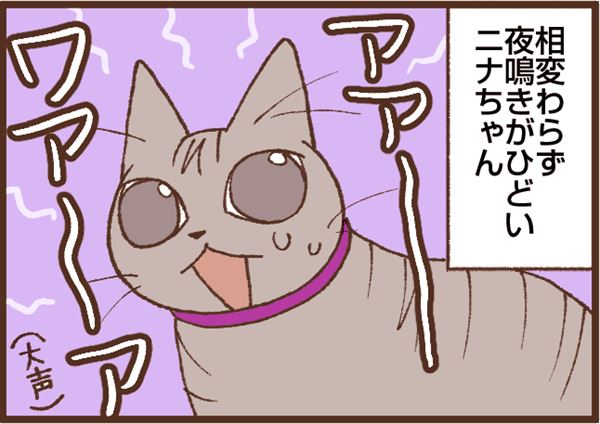ニナちゃんは今年で18才になるとは思えないぐらいふくよかで健康なんですが、本当にこの夜鳴きだけはなかなか…すごい音量です!(笑)