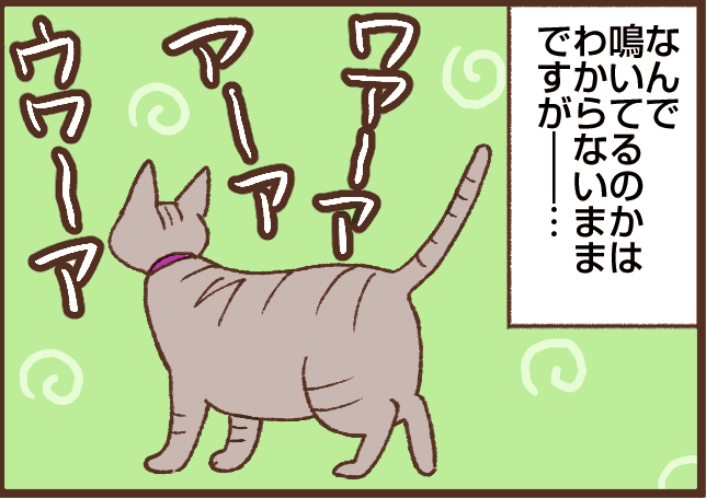 大声で鳴いているときに人と目があったり、声をかけられたりすると「は~い」と返事はしてくれるので、なんかわけがわからなくなってるという感じではないのですが、じゃあホントになんで鳴いてるんだろうと謎は深まるばかりです…(笑)