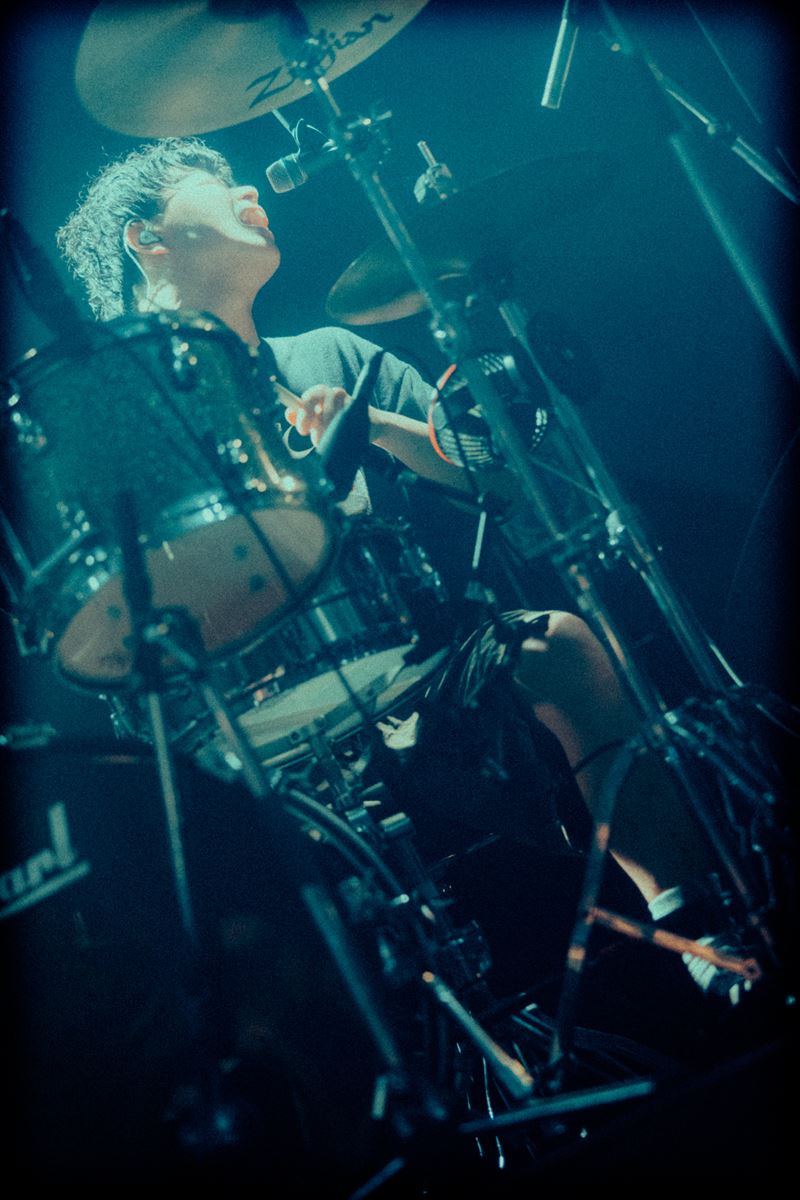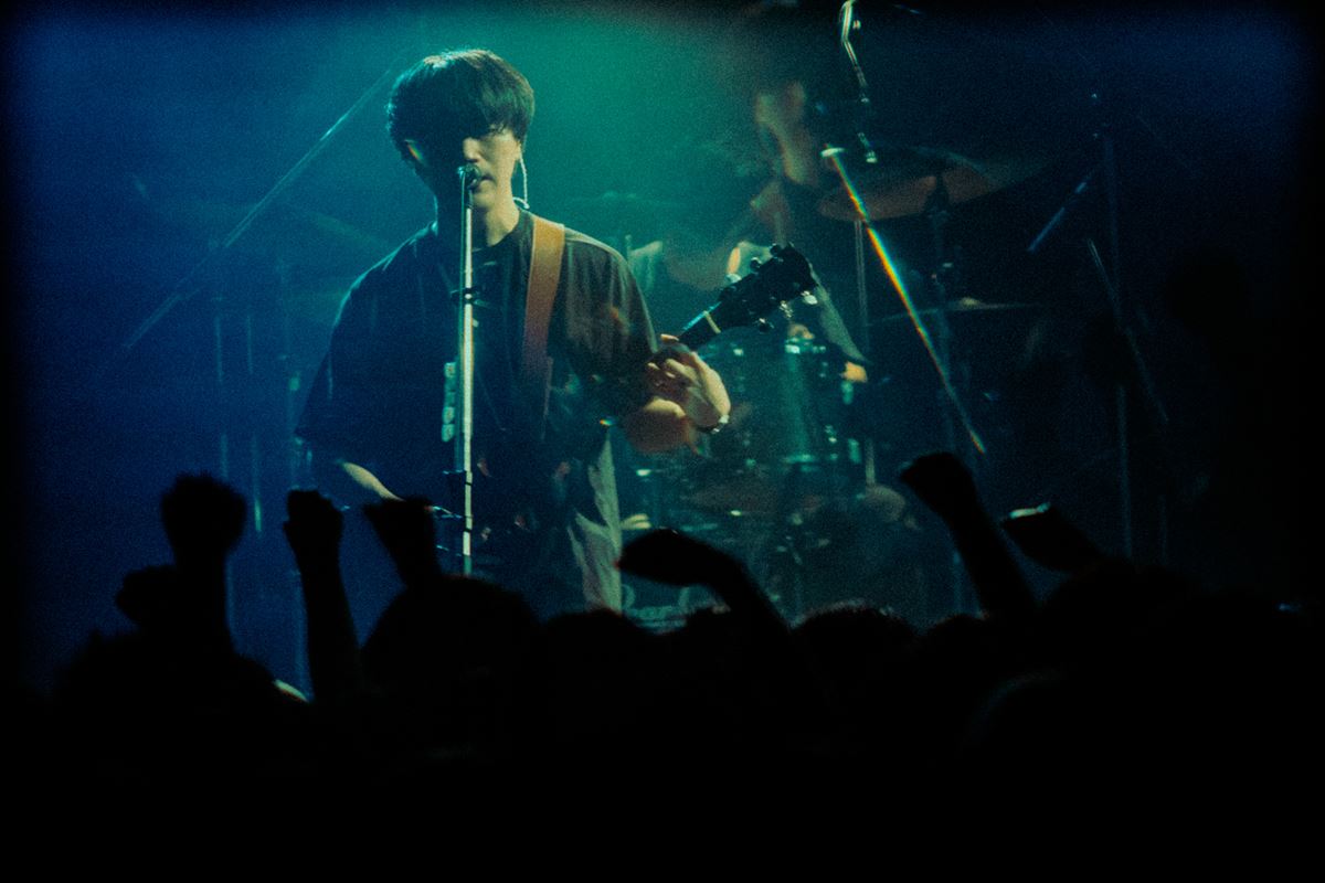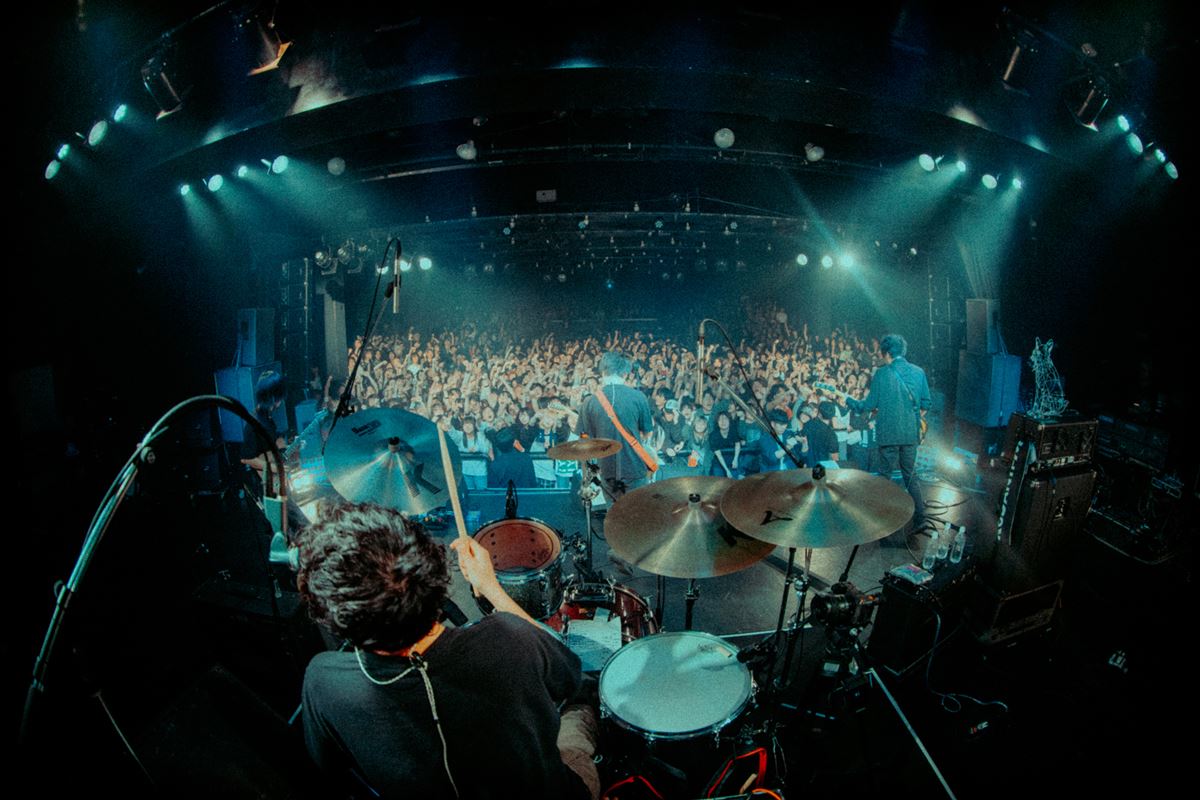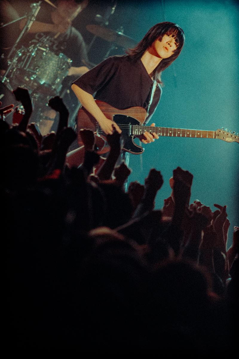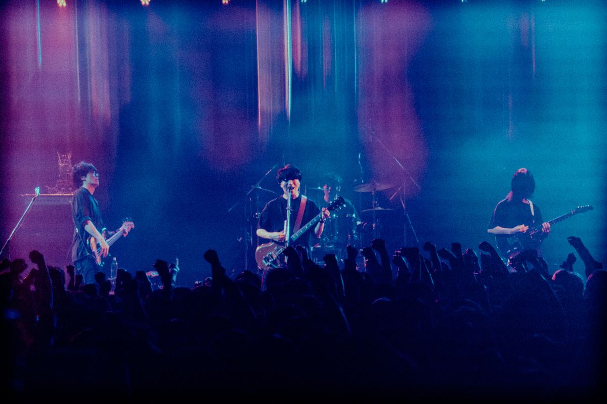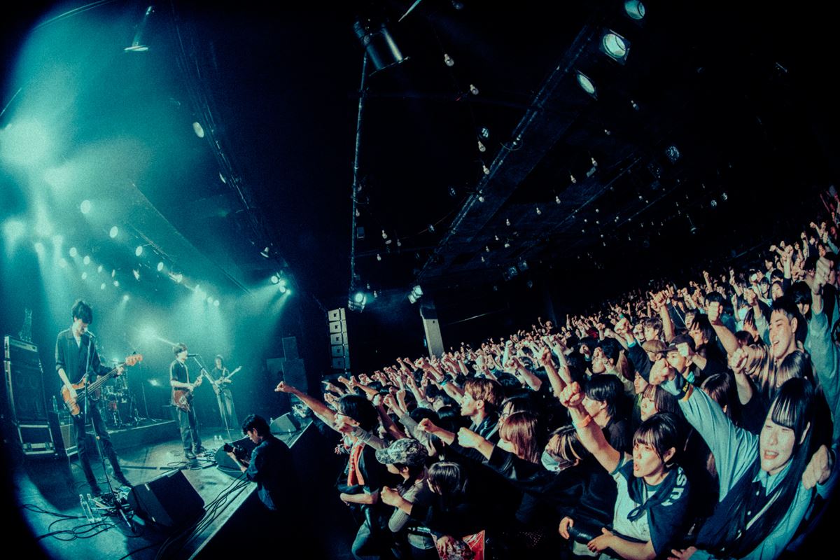 開演時刻、場内に英語のアナウンスが流れ、その音声が乱れていく。バンドメンバーが登場すると、場内は大きな歓声と拍手に包まれた。北(vo/g)がギターをかき鳴らし、ヘヴィなリフが鳴り響く。1曲目は「yeah yeah yeah(Prelude)」。中野(g)と清水(b)が前方に出て煽り、北は「準備はいいか」と叫ぶ。そのままアルバムの曲順通り「いやいやいやいや」へ。フロアでは次々と拳が上がり、リキッドルームは一気に熱狂の渦へと叩き込まれた。気合の入りまくったバンドの演奏と、耳をつんざくような北のボーカル。このツアーを通していかにバンドが磨き上げられてきたかが如実に現れている。流れるようなアンサンブルが美しく響き渡った。「黙れと思う」に続いて、「ここにいた才能」へ。茂木奏佑(ds)の叫びがリキッドルーム中にこだまする。茂木のドラムと清水の弾くゴリゴリのベースが楽曲を牽引し、最後はバンドの音が止まる中、北の歌がエモーショナルに響き渡った。