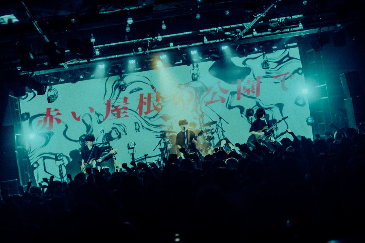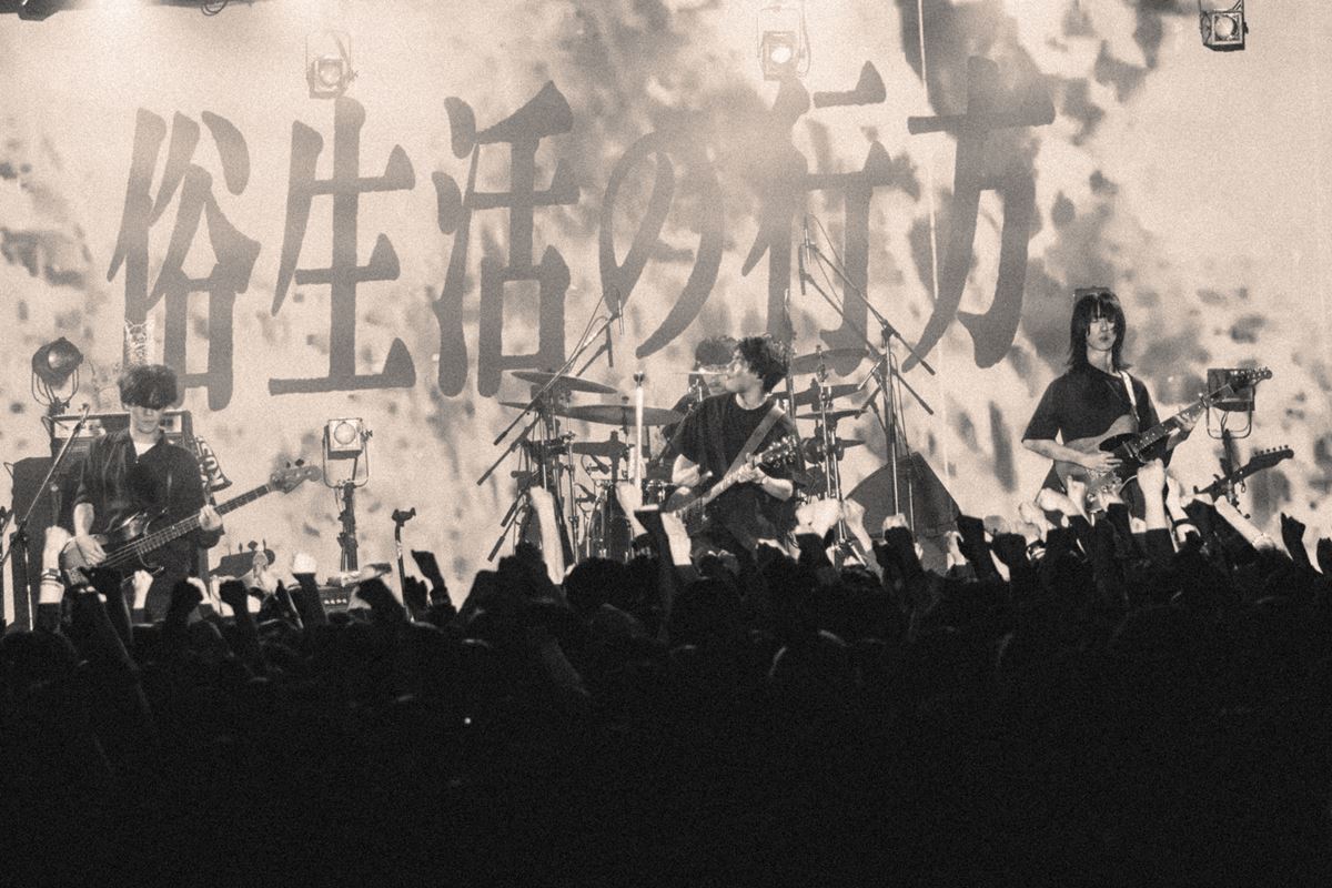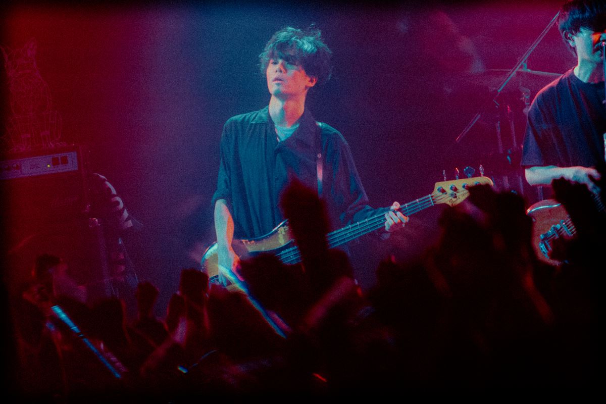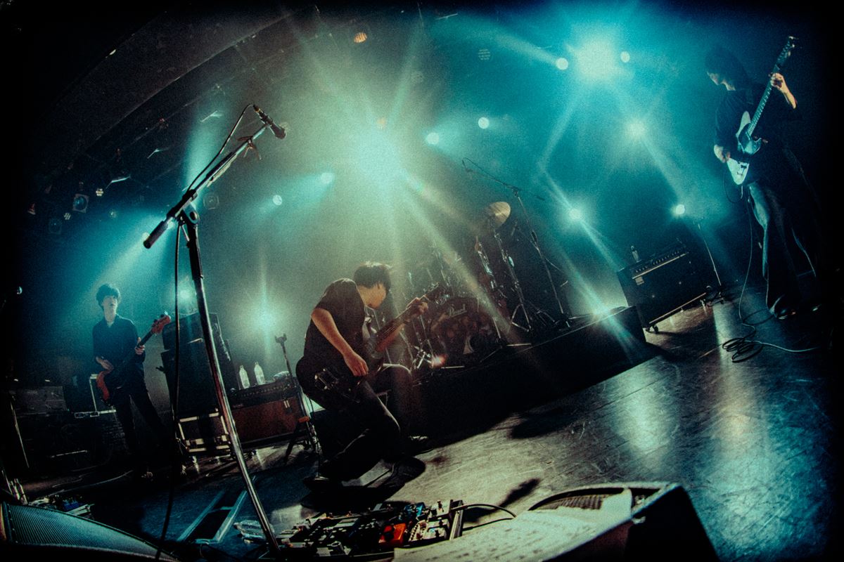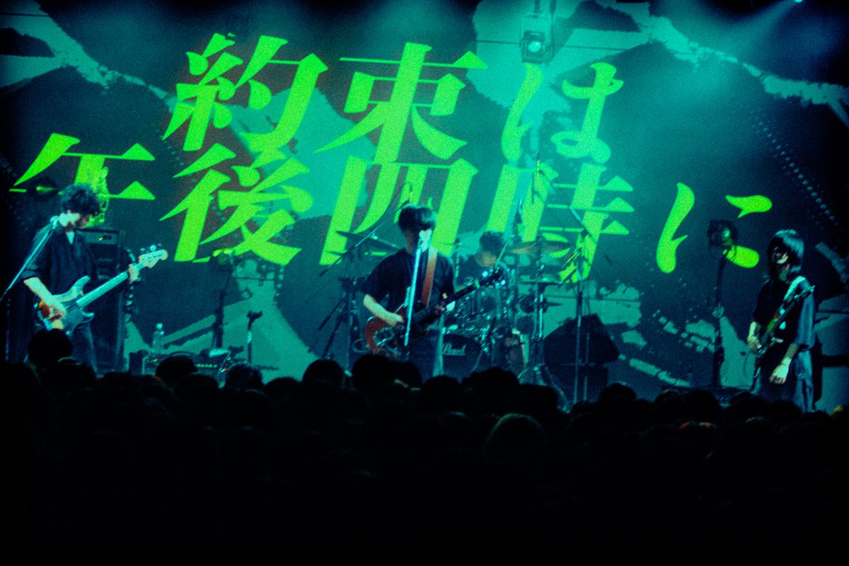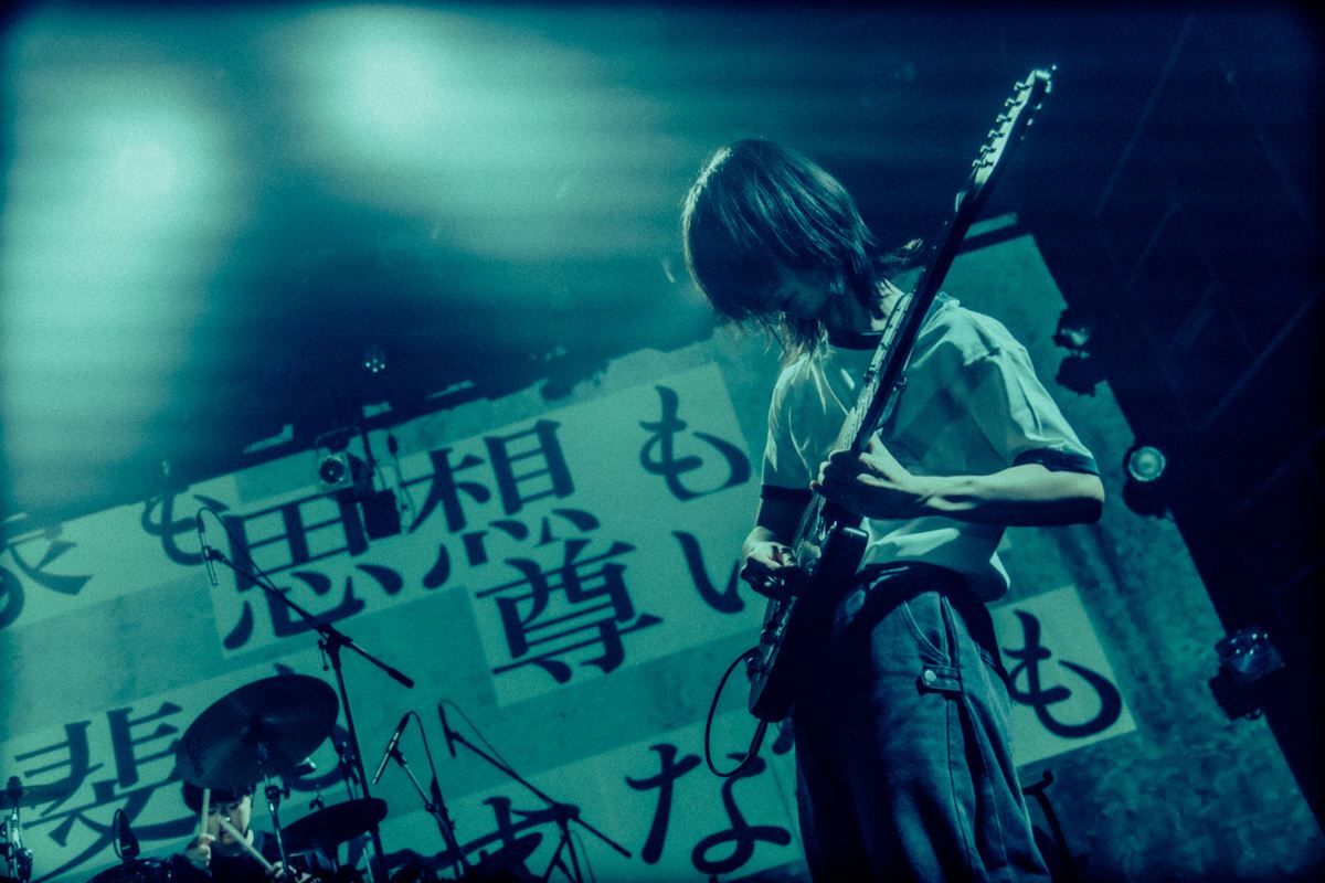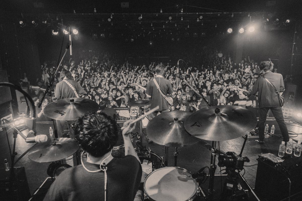 開演時刻、場内に英語のアナウンスが流れ、その音声が乱れていく。バンドメンバーが登場すると、場内は大きな歓声と拍手に包まれた。北(vo/g)がギターをかき鳴らし、ヘヴィなリフが鳴り響く。1曲目は「yeah yeah yeah(Prelude)」。中野(g)と清水(b)が前方に出て煽り、北は「準備はいいか」と叫ぶ。そのままアルバムの曲順通り「いやいやいやいや」へ。フロアでは次々と拳が上がり、リキッドルームは一気に熱狂の渦へと叩き込まれた。気合の入りまくったバンドの演奏と、耳をつんざくような北のボーカル。このツアーを通していかにバンドが磨き上げられてきたかが如実に現れている。流れるようなアンサンブルが美しく響き渡った。「黙れと思う」に続いて、「ここにいた才能」へ。茂木奏佑(ds)の叫びがリキッドルーム中にこだまする。茂木のドラムと清水の弾くゴリゴリのベースが楽曲を牽引し、最後はバンドの音が止まる中、北の歌がエモーショナルに響き渡った。
