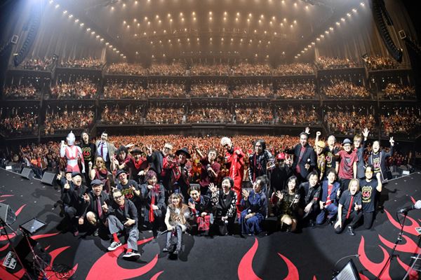 そしてステージに全員集合した状態で歌うトータス松本(ウルフルズ)の「ガッツだぜ!!」、斉藤和義の「歩いて帰ろう」、増子直純の「オトナノススメ」など、アップテンポな曲でさらに客席全体を揺らしていく。本編ラストでは全員に白いハットが配られ、全員でジュリーになりきる。あまりにも似合いすぎる吉井和哉に「カッコいいの禁止だから!」と叫ぶ増子。一番似合うからモノマネで曲紹介をしろという無茶ぶりに、素直に応じる吉井の曲振りで「勝手にしやがれ」の大合唱となった。