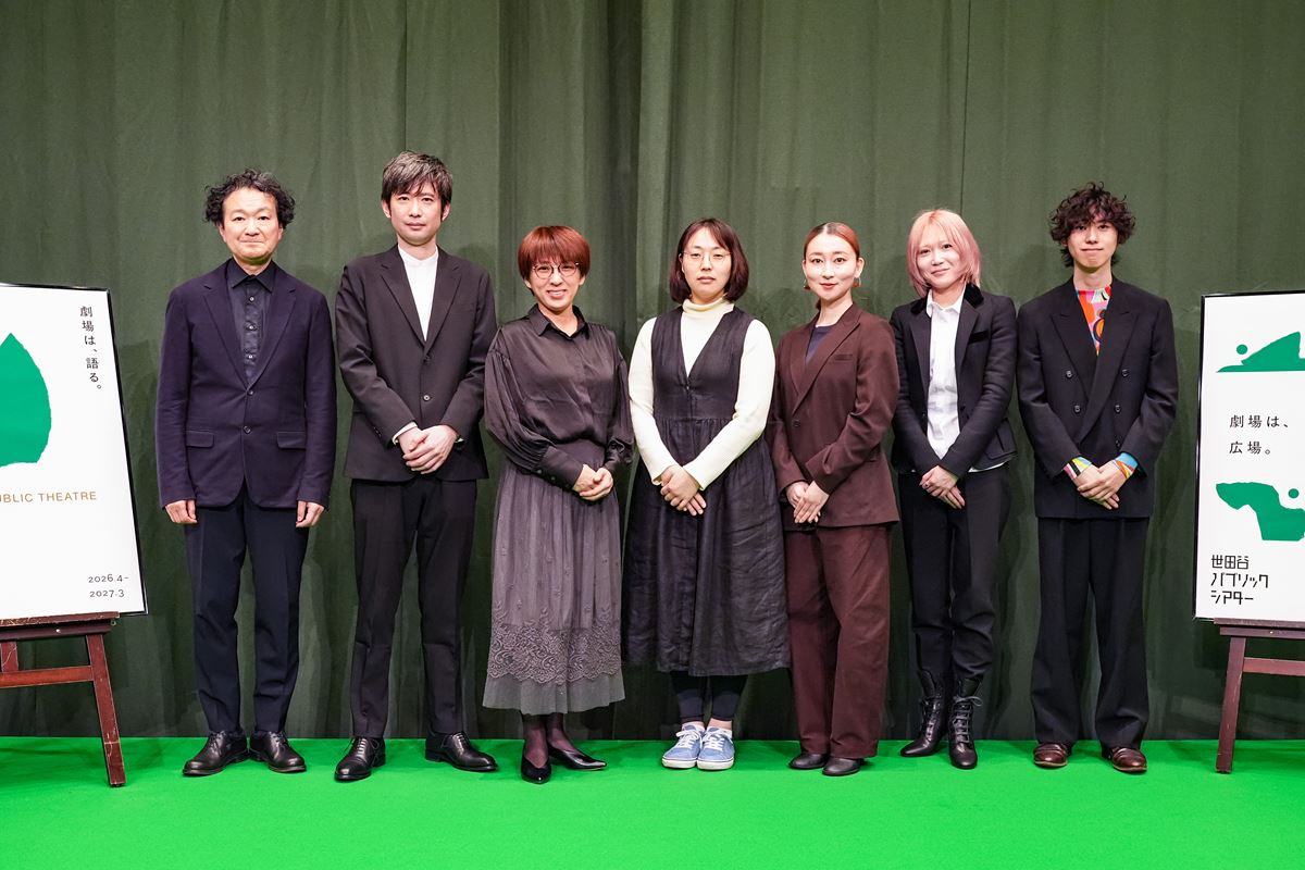 世田谷パブリックシアター2026年度ラインアップ発表会より 左から)白井晃、鈴木アツト、生田みゆき、オノマリコ、稲葉賀恵、大月リコ、草田陸 (撮影:田中亜紀)