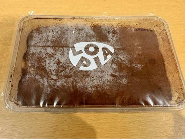 【ロピア 天使のふんわりティラミス】 透明パッケージに入ったティラミスは、上面にココアパウダーがたっぷりかかっており、ふんわり感が伝わります◎