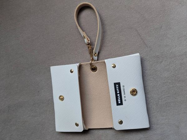 ビニール袋から取り出し、裏にすると、収納スペースは左右2か所あることがわかります。スナップボタン式で開閉がしやすいです。「HELLO KITTY」のシンプルなロゴもポイント。