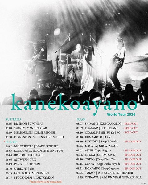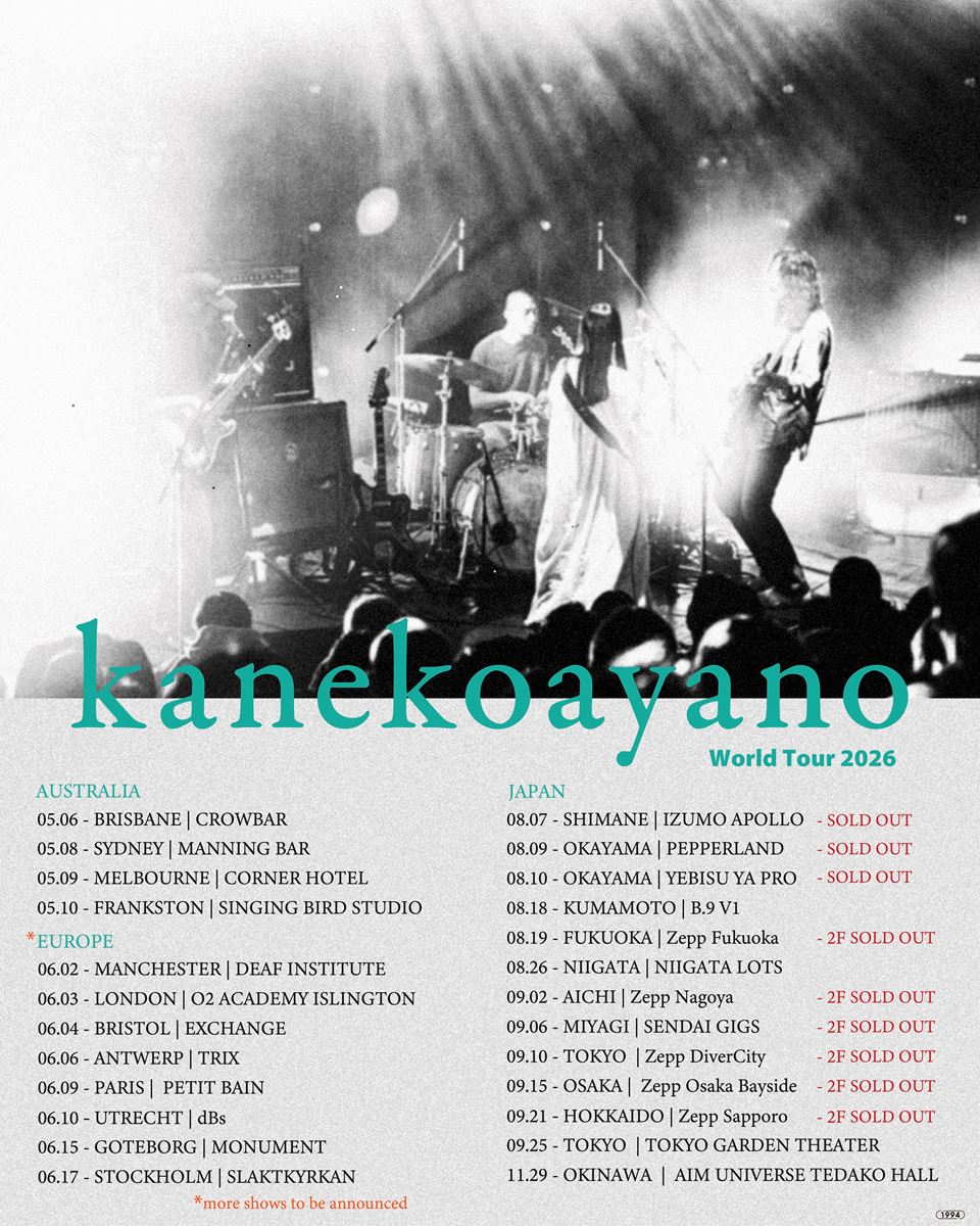 また、4月にはOGRE YOU ASSHOLE presents『""DELAY2026""』、DYGL presents『Crossing 2026』、5月には『CIRCLE '26』の出演を控えている。 さらに、5月からはオーストラリア/ヨーロッパ/日本を巡る『kanekoayano World Tour 2026』の開催も予定している。