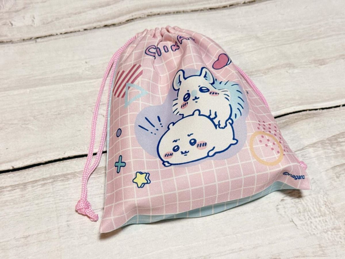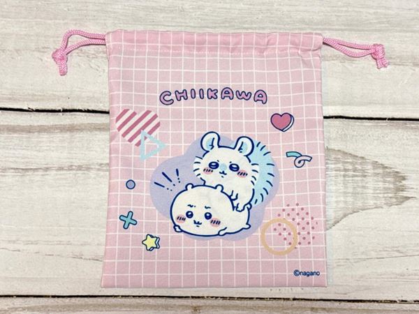 パステルカラーのチェック柄とちいかわたちを組み合わせた、悶絶級にかわいい巾着です。