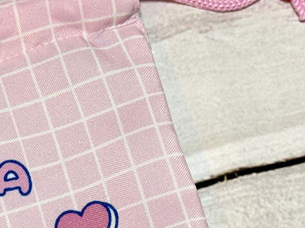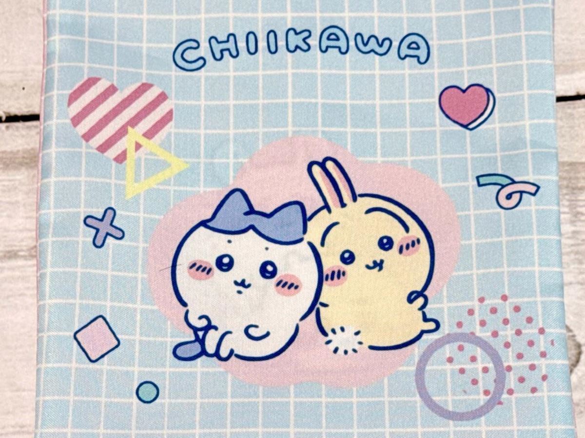 生地はさらっとした手ざわりで、作りもしっかり。フロントはピンクのチェックに、ちいかわの上にモモンガが乗ったイラスト入り。バックはブルーのチェックに、ハチワレとうさぎが並んだイラストがプリントされています。