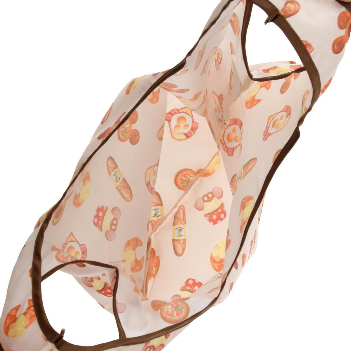 ミニーモチーフのカップケーキやミッキーモチーフのピザパン、ベーコンエッグトーストなどの総柄デザインのバッグです。