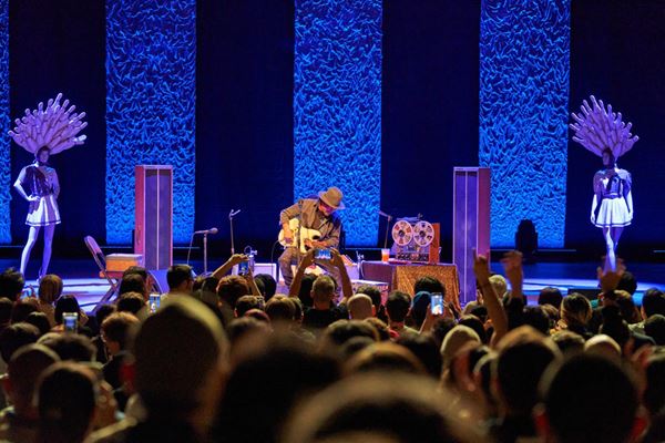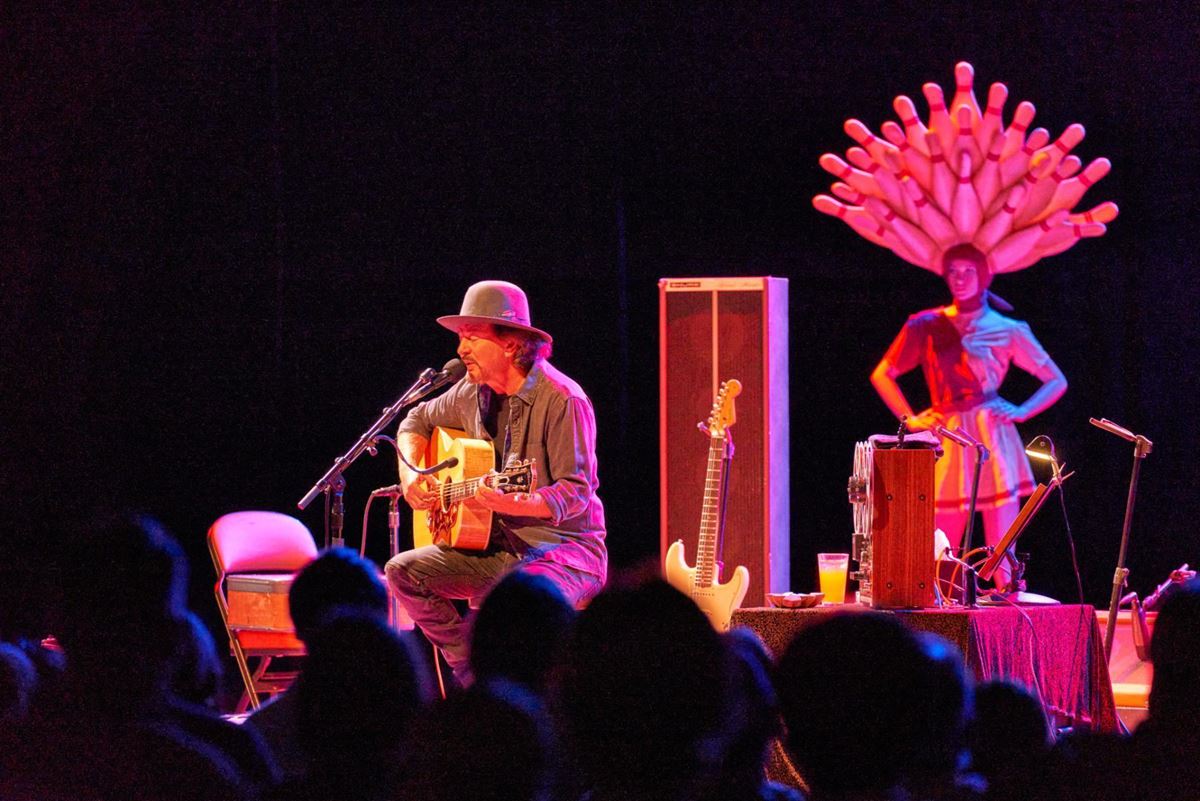 予想通り、舞台デザインはNetflixドキュメンタリー『マター・オブ・タイム:希望を歌にのせて』でフィーチャーされたライブ・シーンとほぼ同様。円形のペルシャ絨毯を敷いたステージには、アンプやエフェクター、オープンリールなどの機材のほか、頭にボウリングのピンをぶっ刺した2体の奇妙なマネキンや、ヴィンテージのトランクケース(『パール・ジャム 20』のボーナス映像を見るとわかるが、エディの自宅には各ツアーごとのノートなどを格納したトランクが山積みだ)が並べられている。とりわけ足元に置かれたストンプボックスとカホンペダル(ザ・フーなどのステッカーが確認できた)がこのライブのキモで、大地を踏み鳴らすようなエディのキック音は、地球を伝ってブラジルまで届きそうなほどデカい。いわばコンサートというより路上演奏⋯⋯バスキングに近い構成で、公私にわたって親交が深いグレン・ハンサードをはじめとする、バスカーたちに対するエディなりのリスペクトなのかもしれない。