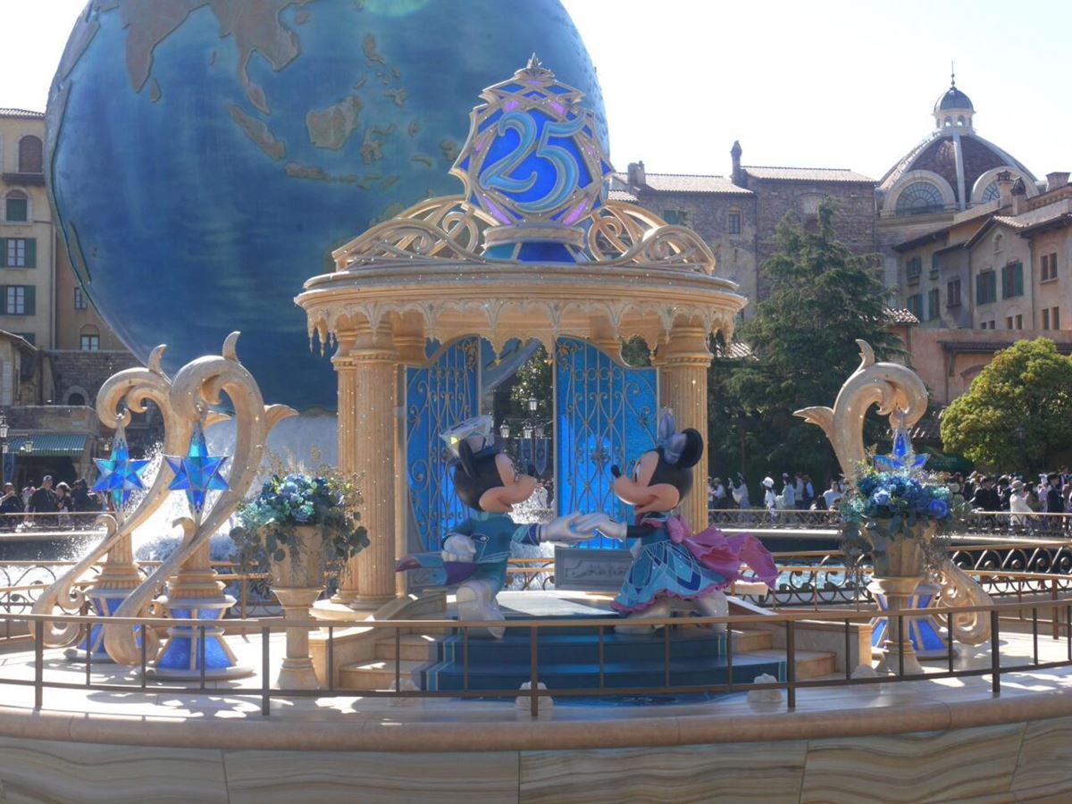 ゲストが入園後、最初に目にする東京ディズニーシーのシンボル「ディズニーシー・アクアスフィア」の前には、25周年のロゴとミッキー、ミニーの豪華なデコレーションが登場。
