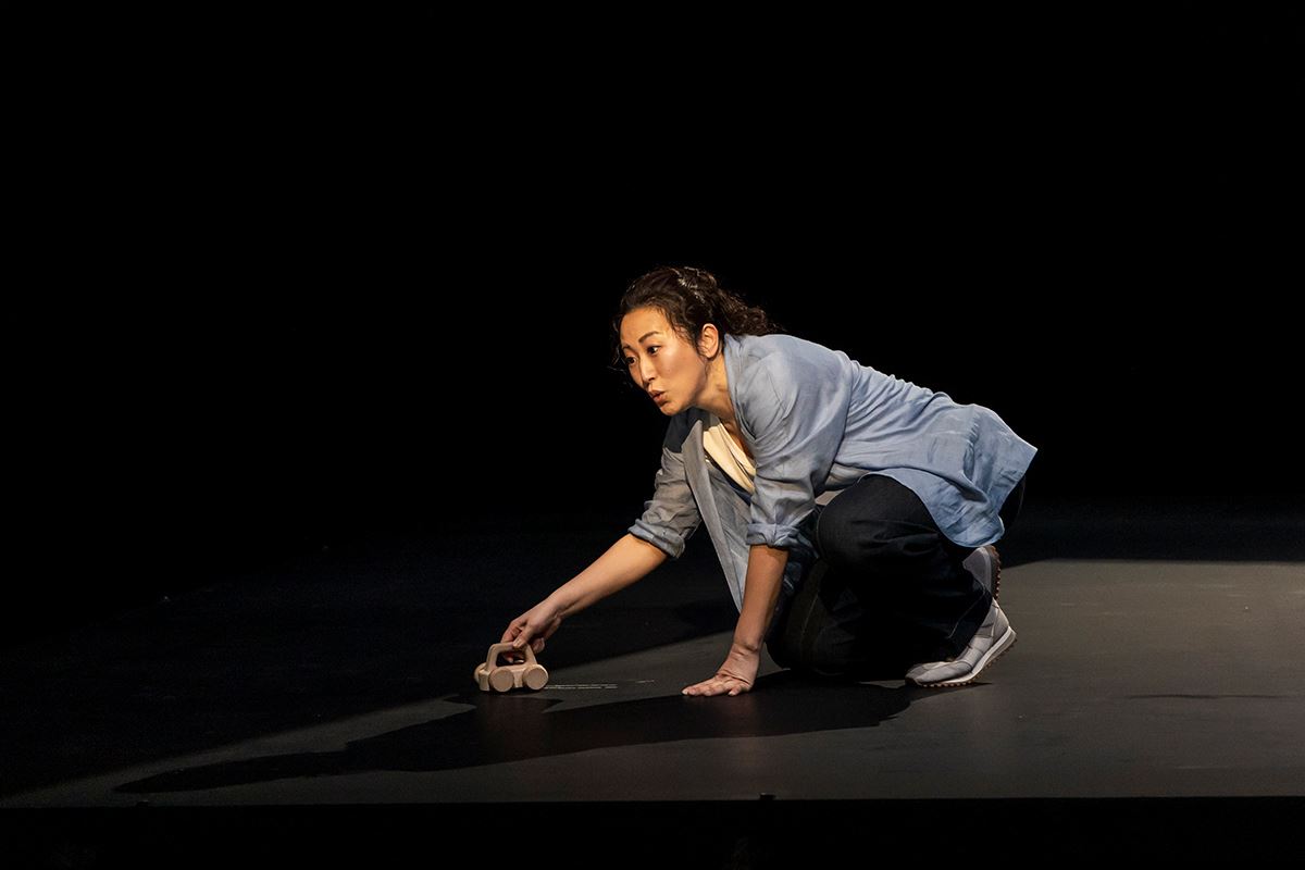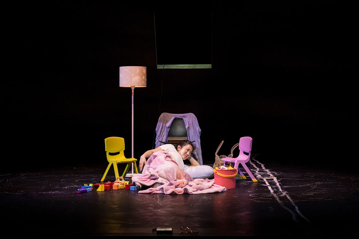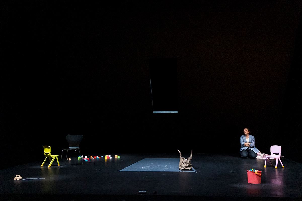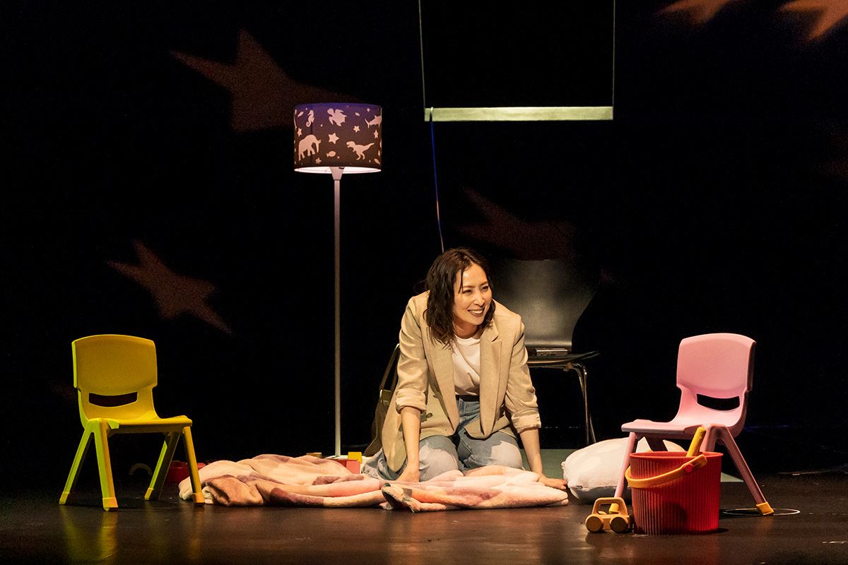 ここまでは客電もついた状態で進み、そこから暗転。次はいわゆる舞台の照明となり、<わたし>が子どもたちと過ごした時間、記憶の再現「シーン」へと変わる。ただそこに子どもたちを演じる俳優はいない。目に見えない子どもたちと<わたし>の日常を演じる。