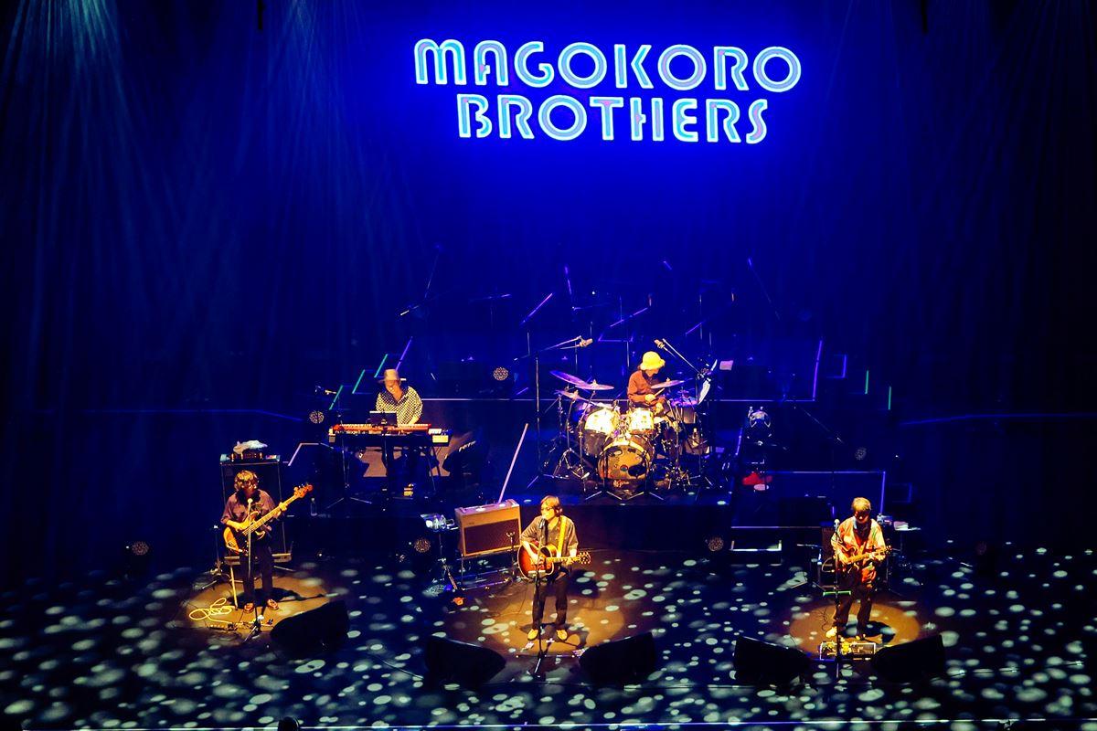 ステージ後方上部の、おなじみの「MB’s」のロゴが、「MAGOKORO BROTHERS」のLEDに入れ替わって、「パッチワーク」でライブがスタートする。次の「BABY BABY BABY」を終えたところで、YO-KING、「よかったよ、(メンバー皆が)元気で。生存確認終了!」と挨拶。桜井は、このLED看板は、豆電球で点灯する前の看板の老朽化のため、新しく作ったことを説明する。「減価償却するまで、やめられませんよ!」。