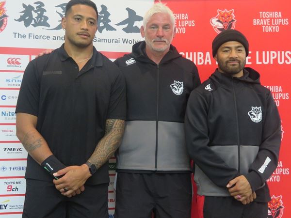 (写真左より)シャノン・フリゼル(東芝ブレイブルーパス東京)、トッド・ブラックアダーHC(同)、リッチー・モウンガ(同)